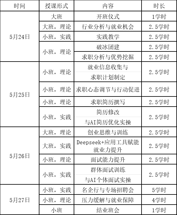 培训课程紧密围绕大学生职业生涯发展和就业创业现实问题,以促进就业意识、转变就业态度、提升就业能力、推动就业行动为课程目标,总学时为40课时。