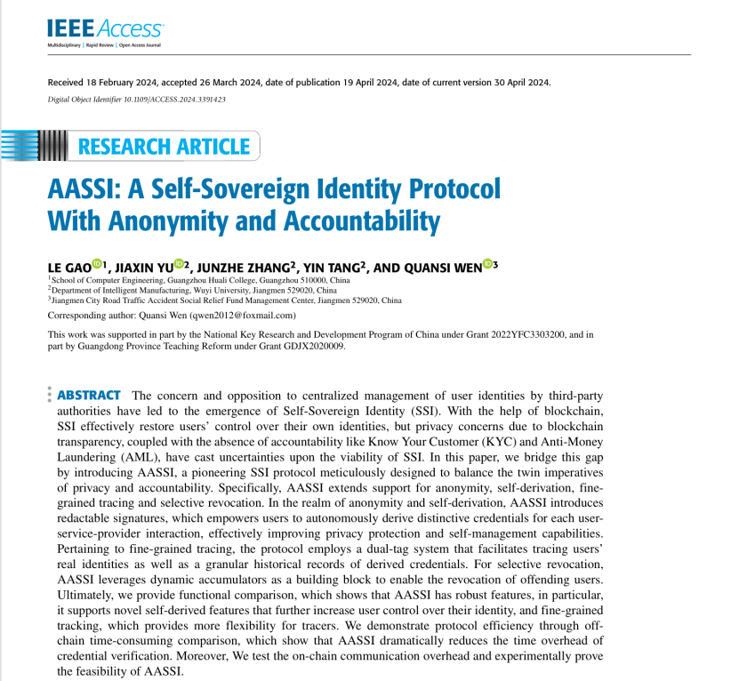 优秀学术论文成果展示7:AASSI: A Self-sovereign Identity protocol with Anonymity and Accountability