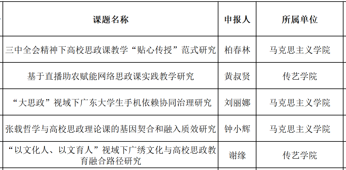 根据广东省教育厅《广东省教育厅关于开展2024年度广东省高校思想政治教育课题、中小学德育课题申报工作的通知》,我校组织开展了申报工作,经科研处形式审查、校内专家小组评审,遴选出5个项目。现将结果予以公示,详情见附件。