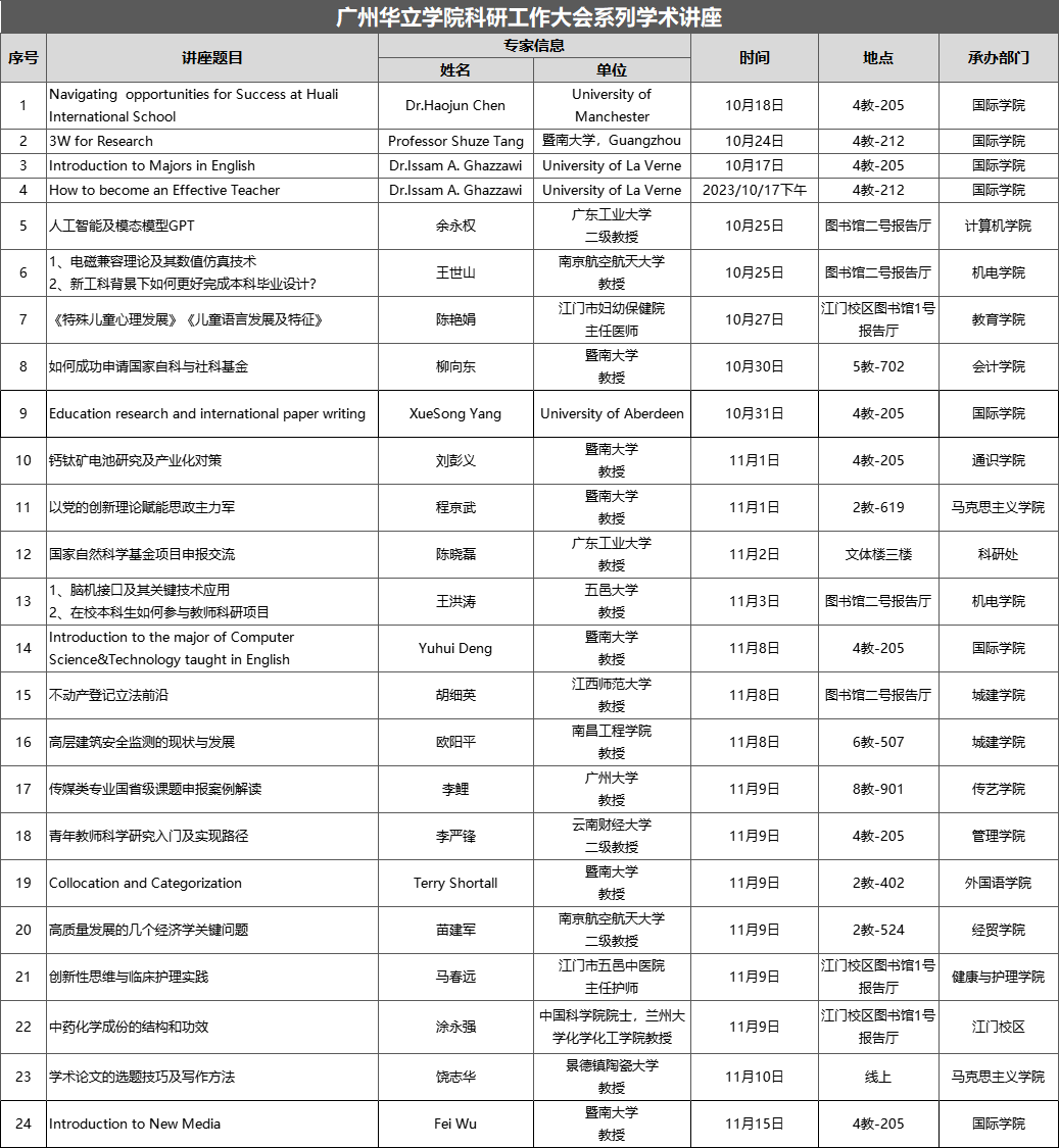 11月2日,广州华立学院在文体楼隆重举行全校科研工作大会。大会的主题是:以科技创新推动学校高质量发展。校长刘洁生、校党委书记李琼生、以及校领导柏育红、蔡敏、欧洁梅,王学军,李玉林、郭仲先出席会议,各二级单位负责人、学科带头人、研究机构负责人、以及全体教师分广州校区和江门校区两个会场参加大会。大会为期一天,由科研处处长李有红主持。