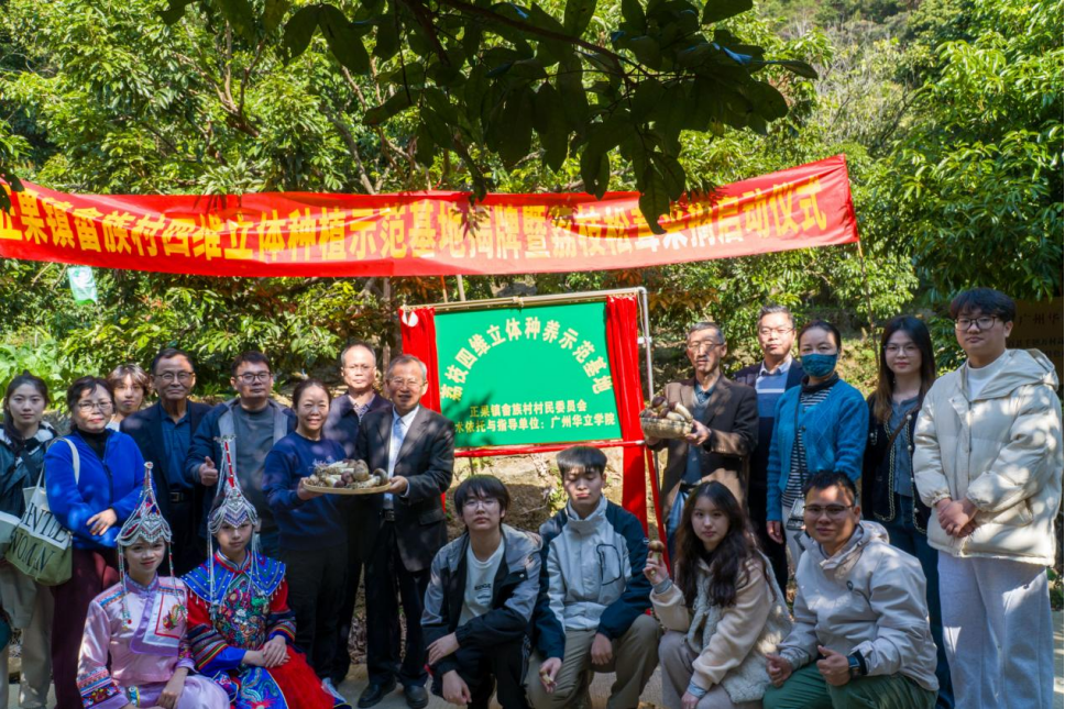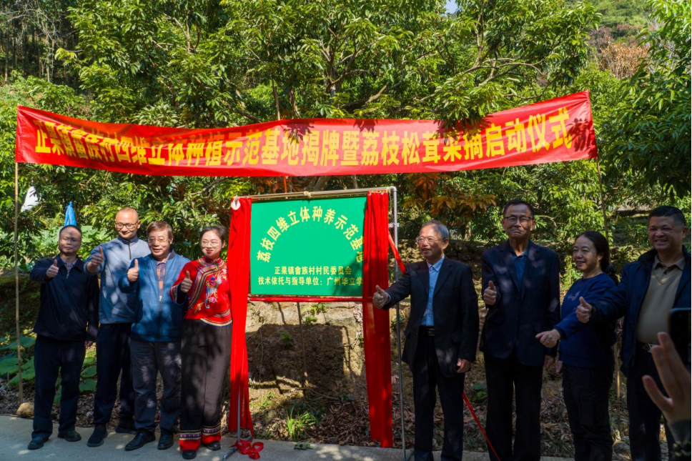 2025新年第一天,正果镇畲族村举行了“四维立体种养示范基地”揭牌暨红松茸采摘启动仪式。这一盛大活动吸引了来自各单位的领导、专家和媒体记者。仪式在红松茸种植基地举行,增城区正果镇领导,增城区科创局领导,广州华立学院校长刘洁生、副校长吴萍、乡村振兴特色产业研究院李向林教授、科研处处长李有红、城建学院院长寇广孝、中国科学院华南植物园段俊教授,畲族村雷映霞书记、以及师生、村民代表50余人一同见证了这一重要时刻。