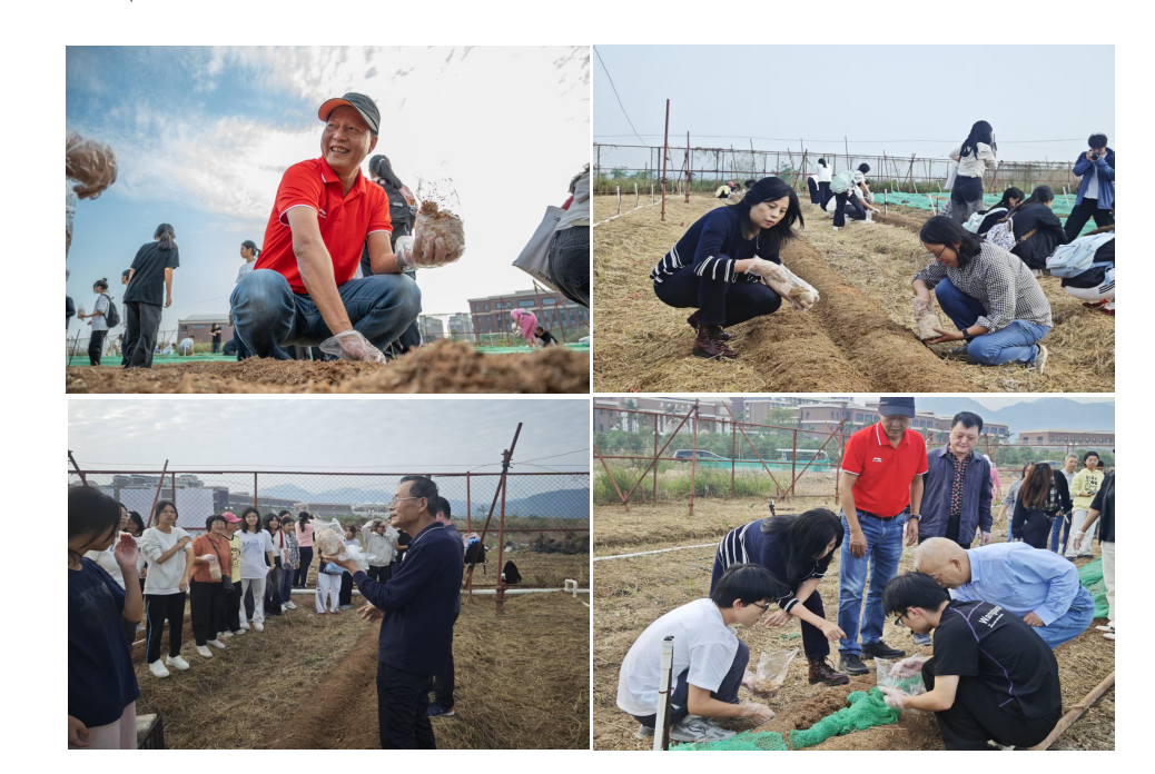 在简短而隆重的基地启用与种植启动仪式后,校、院领导与学生们分组协作,全身心投入种植实践。从菌棒规范放置、均匀覆土到科学浇水,师生携手完成种植全流程操作,在亲身劳作中沉浸式体验农业生产的艰辛与乐趣。此次实践让同学们进一步领会 “果—药—菇—蜜” 四维一体种养模式的内涵,有效提升了动手操作能力与团队协作意识,实现了理论知识与实践应用的深度衔接。