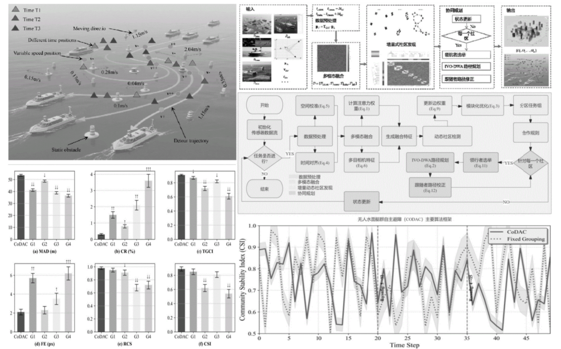 该方法构建了一套从精准感知、智能融合到动态协同、自主决策的完整技术链。首先,通过IEEE 1588协议同步LiDAR点云、相机图像、雷达数据、AIS数据,并基于外参矩阵实现跨模态空间对齐;其次,联合跨模态注意力机制与可变形卷积建立通道与空间维度相关性,使得融合后的多模态特征生成高精度环境语义信息;接着,基于时变图增量式模块度动态划分无人艇任务组,仅更新受扰边集以降低计算复杂度;最后,无人艇领导者采用改进速度障碍模型(IVO‑DWA)优化多目标路径,跟随者通过斥力势场修正轨迹,实现实时、安全且合规地集群避障。