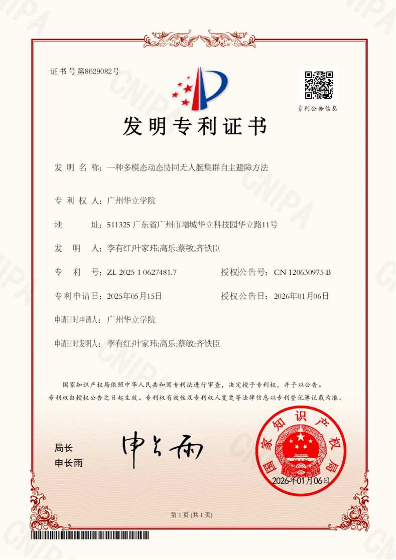 近日,我校智能特种装备工程技术研发中心在无人系统智能协同与自主控制领域取得重要突破,由李有红、叶家玮、高乐、蔡敏、齐铁臣等教师共同研发的“一种多模态动态协同无人艇集群自主避障方法”获得国家知识产权局发明专利授权。此项成果标志着我校在智能无人艇集群协同控制与复杂环境感知方面的技术研发能力迈上新台阶。