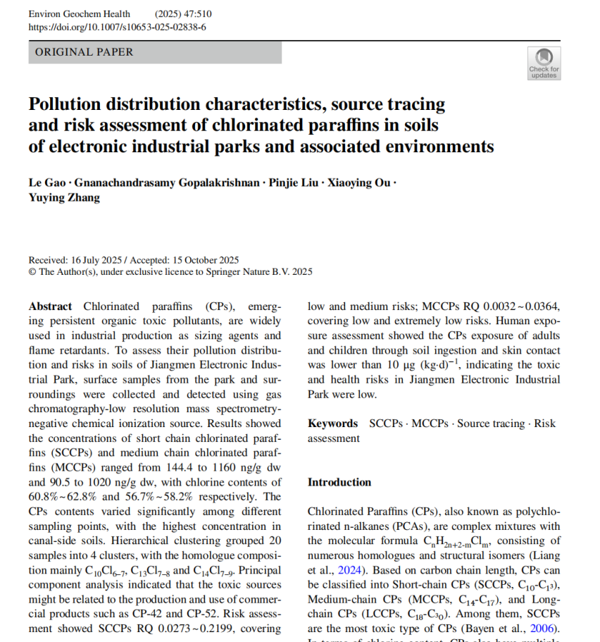 2025年10月,广州华立学院高乐、刘品洁等老师组成的研究团队在人工智能环境科学领域取得新突破。论文《Pollution distribution characteristics, source tracing and risk assessment of chlorinated paraffins in soils of electronic industrial parks and associated environments》已于人工智能环境领域期刊《Environmental Geochemistry and Health》(Jcr分区Q1,中科院SCI三区,影响因子3.8)正式发表,为粤港澳大湾区电子制造集聚区的环境污染管控提供了科学依据。