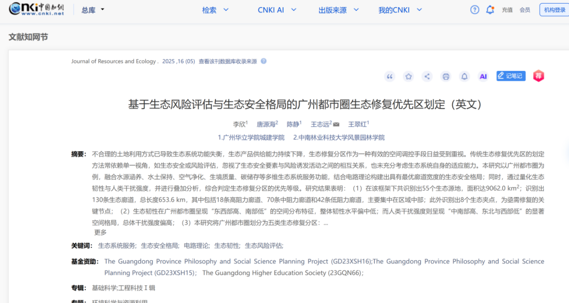 2025年9月,由广州华立学院城建学院李欣、陈静、王翠红组成的研究团队在城市生态安全与修复规划领域取得重要进展。团队共同完成的论文《基于生态风险评估与生态安全格局的广州都市圈生态修复优先区划定》已在资源与环境领域重要学术期刊《Journal of Resources and Ecology》(CSCD收录,复合影响因子1.7)正式发表。该研究创新性地融合生态系统服务、生态安全格局、生态韧性评估与人类干扰分析,构建了一套综合识别生态修复优先区的科学框架,并首次应用于广州都市圈,为该区域生态保护与系统性修复提供了精准、可操作的空间指引。