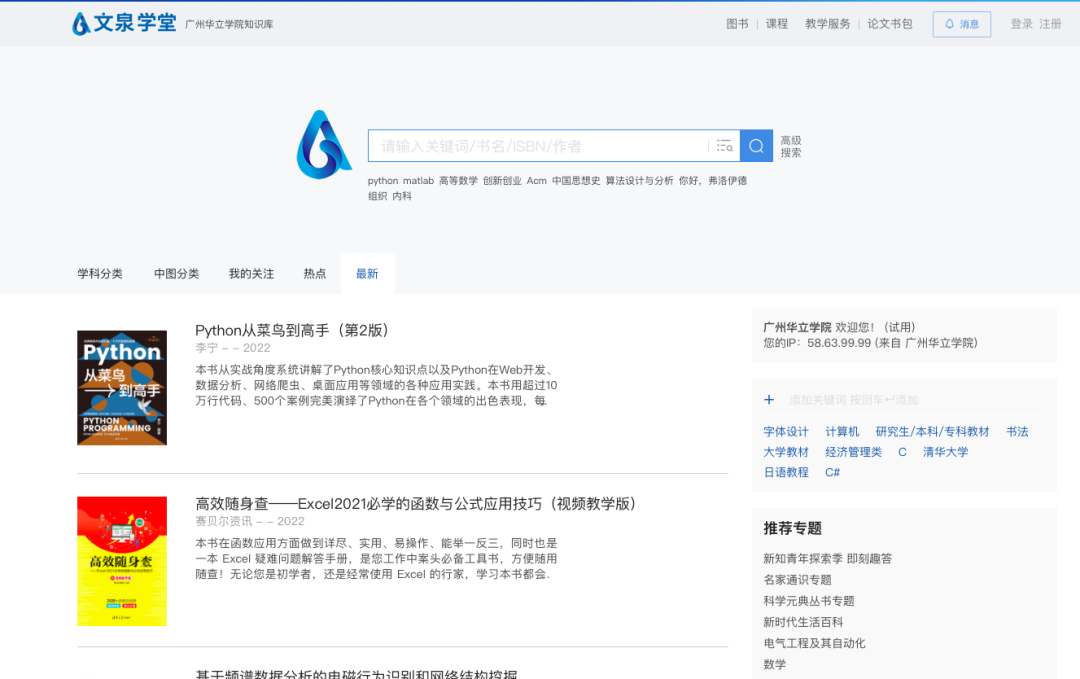 高等教育学科建设知识库——文泉学堂”以清华大学出版社联合25家大学出版社近10年的正版电子书资源为基础,聚合多媒体附件和特色课程内容资源,内嵌教师服务功能。专为高校师生定制的专业知识内容资源,助力高校建设一流学科和特色专业,方便师生快捷、精准查找知识内容,高效率阅读和学习。