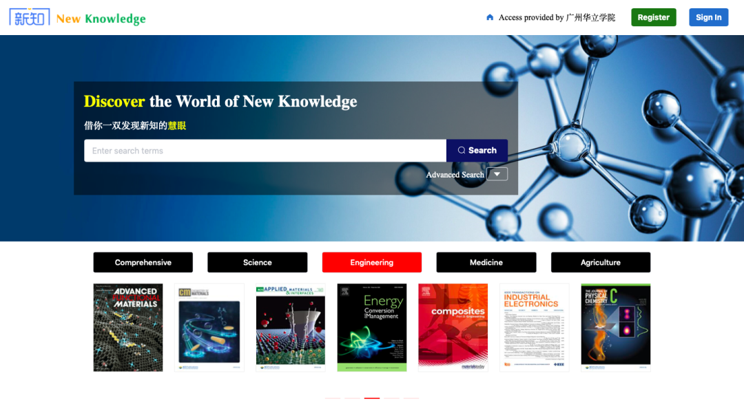 “新学术外文高影响力期刊整合服务平台(High-lmpact Article Collection) ”是专业的外文期刊精选整合服务平台。该平台精选国际上主流刊源的高品质学术刊物6000余种,包含国内外著名高校及科研院所出版的论文500多万篇,是辅助教学科研、了解国外学科前沿动态的有效工具。现为我校开通基础科学与工程技术、人文社科领域内容试用。