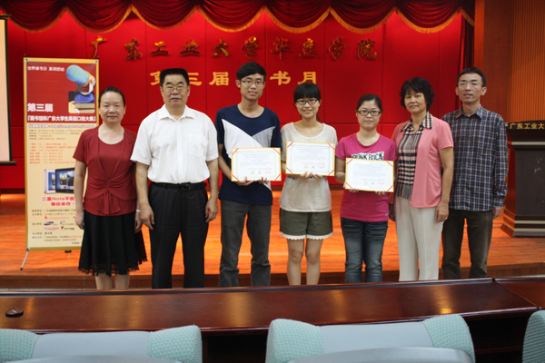 学院领导非常重视本次大赛,今天上午10点30分,学院常务副院长詹业宏,党委书记王锦绣,副院长王学军,图书馆馆长赖卫桥在学院第三届读书月活动总结大会上为获奖选手颁奖。对参赛获奖选手表示热烈的祝贺,并希望图书馆今后积极组织更多学生参与下次图书馆杯广东省英语口说大赛,再创佳绩!