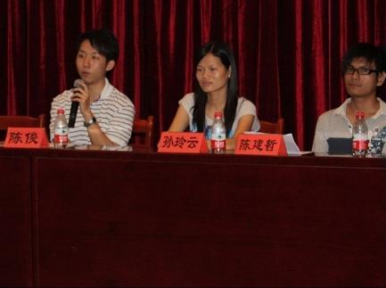 报告会邀请我院06级信息工程3班陈建哲、孙玲云,06会计2班陈俊同学主讲,他们分别以优异成绩考取广东工业大学、五邑大学及广东商学院2010年硕士研究生。三位同学以亲身经历和自我实践,向学弟学妹们讲述考研过程中的艰辛与痛苦、成功与喜悦…,他们的现身说法激发了大家的学习热情,燃起了大家心中的渴望。现场互动交流、提问,再次掀起高潮,十几位同学争先提问,关于考研学校和导师的选择;数学、英语、政治、专业课复习方法及考试技巧等。嘉宾们逐一解答,并鼓励大家,在考研的征程中一定要有足够的决心、信心和耐心;一定要有坚持到底,不达目的不罢休的顽强意志。