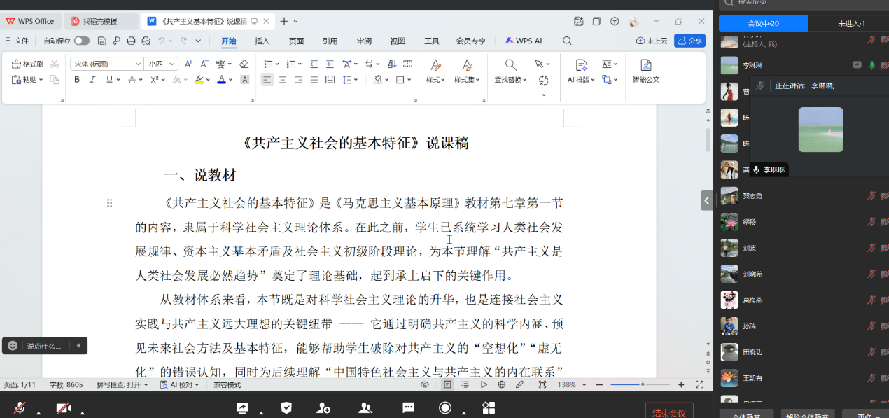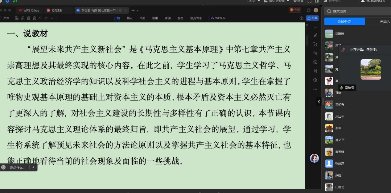 备课会上,三位老师分别结合各自授课专业与学生特点,展示了风格鲜明、重点突出的教学设计。李佳雯老师面向汉语言文学及小学教育专业学生,采用“视频导入+小组讨论” 的互动模式,以“良心企业家”案例引发学生对理想社会的构想,进而自然过渡到马克思主义预见未来社会的方法论和共产主义社会特征讲解,注重情感共鸣与价值塑造。