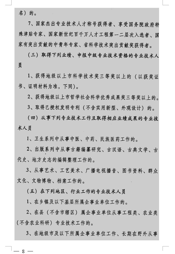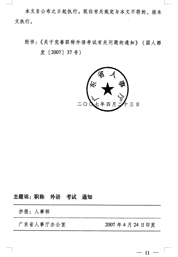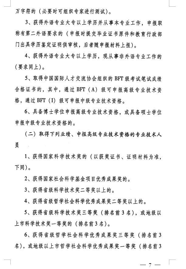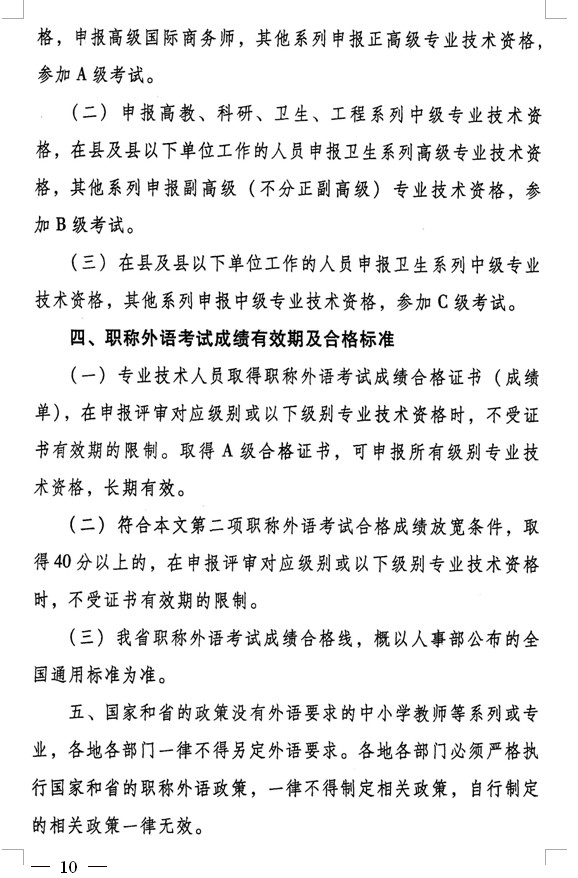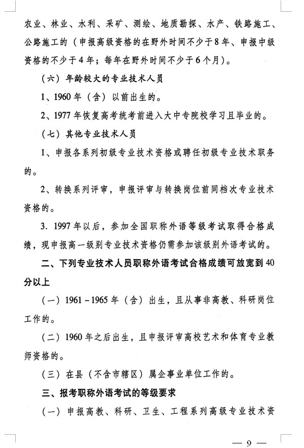 各省、自治区、直辖市人事厅(局),新疆生产建设兵团人事局,部分副省级市人事局,国务院各部委、各直属机构和中央管理的企业人事部门: 外语是专业技术人员学习国外先进知识和技术,开展对外学术技术交流的重要工具。随着科教兴国和人才强国战略的深入实施,我国专业技术人才队伍规模不断扩大,行业分布更为广泛,整体素质不断增强,外语能力也得到明显提高,但逐步提高专业技术人员外语水平仍是一项长期任务。按照严格要求、实事求是、区别对待、逐步提高的原则,在总结各地区各部门职称外语考试工作的基础上,现就完善职称外语考试有关问题通知如下: 一、坚持严格要求,不断加强专业技术人员外语能力建设 在科技飞速发展和经济全球化的新形势下,国际交流日益频繁,我国与世界的联系更加密切,外语越来越成为专业技术人员能力建设的重要方面。在专业技术人才队伍建设中,要按照各专业技术职务试行条例的规定,继续坚持对职称外语的严格要求,引导广大专业技术人员不断提高外语能力,更好地学习国外先进知识和技术,加强对外学术技术交流。 人事部将会同有关部门不断改革完善外语测试办法,改进测试方式,为专业技术人员提供更加科学、客观、便捷的外语应用能力评价服务,为用人单位合理使用人才服务。 二、坚持从实际出发,区别对待,防止职称外语考试“一刀切”和形式主义 (一)对经证明具有较高外语能力的专业技术人员,可不参加职称外语考试。 1.具有国家认定的相应留学经历的; 2.申报副高级职称时职称外语考试成绩达到要求,申报正高级职称需再次参加同一级别考试的; 3.出版过外文专著、译著或以其他方式证明具备较高外语水平,并经一定程序确认的。 (二)符合下列条件之一的专业技术人员,可放宽外语成绩要求或不参加职称外语考试。 1.经审核确认,能力业绩突出、在本行业本地区作出重要贡献的; 2.在乡镇以下基层单位(经省级政府人事部门批准,可放宽至县级以下基层单位)从事专业技术工作的; 3.在地市以下单位,长期在野外从事农业、林业、水利、采矿、测绘、勘探、铁路施工、公路施工等专业技术工作的; 4.年龄较大并长期从事专业技术工作的。 (三)符合下列条件之一的专业技术人员,可不参加职称外语考试。 1.从事具有中国特色、民族传统的临床中医药、民族医药、工艺美术、古籍整理、历史时期考古等专业技术工作的; 2.取得外语专业大专以上学历并从事本专业工作,申报职称有第二外语要求的; 3.申报各系列初级职称的。 三、分级确定全国职称外语考试成绩使用办法 根据当年全国职称外语考试命题和考试情况,人事部确定各语种、级别、类别的全国通用标准。各省、自治区、直辖市人事厅(局),国务院各部委、各直属机构和中央管理的企业人事部门结合全国通用标准,按照管理权限确定本地区、本部门职称外语考试成绩使用办法和有效期。 各省、自治区、直辖市人事厅(局),国务院各部委、各直属机构和中央管理的企业人事部门应按照本通知精神,结合本地区、本部门专业技术人才队伍实际情况,制定具体的配套政策,于2007年4月30日前报人事部专业技术人员管理司备案,并认真做好全国职称外语考试工作。