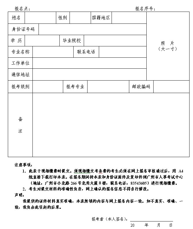 各区、县级市人事局考试管理机构,市直有关单位人事部门: 根据人力资源和社会保障部人事考试中心《关于做好2010年度全国专业技术人员职称外语等级统一考试考务工作的通知》(人考中心函〔2009〕63号),2010年度全国专业技术人员职称外语等级统一考试(以下简称“职称外语等级考试”)定于2010年3月28日进行。为做好我市职称外语等级考试报名工作,现将有关问题通知如下: 一、考试时间 2010年3月28日上午9:00–11:00。 二、适用范围 职称外语等级考试适用范围,暂按广东省人事厅《关于调整完善我省职称外语政策的通知》(粤人发〔2007〕120号)执行,见附件1。 三、语种和专业类别 考试语种:英语、日语、俄语、德语、法语、西班牙语。其中,英语分为英语综合、英语理工、英语卫生三个类别,每个类别分A、B、C三个级别,其他语种不分类别,只分A、B、C三个级别。考生可阅读附件1后选择报考级别。 四、考试方式 (一)英语各类别、级别和日语、俄语、德语、法语、西班牙语各级别的试卷均为客观题,全部在答题卡上用2B铅笔填涂作答。英语各级别的试卷均分为A、B卷,考生在应考时应认真阅读“应考人员注意事项”,按要求填涂信息卡。 (二)考生应考时,可携带一本正式出版的一般通用的公共外语词典(不得带电子词典及社会上专门为职称外语等级考试编写的词典)、2B铅笔、橡皮、黑色墨水的钢笔或签字笔,其他物品不得带入考场。 五、报名时间和办法 2010年度职称外语等级考试实行网上报名,凡在广州市参加考试的人员,均须登陆广州考试信息网(http://www.gzexam.com.cn)或中国广州人事网 (http://www.gzpi.gov.cn/gzexam)完成报名手续。 (一)报名缴费时间 2009年11月16日–2010年1月15日。在上述时间区间内,广州市人事考试中心开通职称外语等级考试网上报名系统,24小时不间断接收考生网上报名。 (二)报名办法 任何地方(国内外)打开连接互联网的计算机→寻找到广州考试信息网(http://www.gzexam.com.cn)或中国广州人事网(http://www.gzpi.gov.cn/gzexam)→点击进入“网上报名”→ 考生注册并填写《个人基本信息录入表》→确认“网上报名协议”→选择考试类别→跟随“指引”阅读须知→ 选择考试地点(考区)→选择报考级别、语种→打印照相凭条→到指定照相馆(见附件2)照相(相片由照相馆直接上传到报名系统中,考生可于照相24小时后上网查询本人相片)→网上支付考务费→完成报名手续。 请在缴费前认真核对本人资料、报考级别、专业等信息,考务费列入“收支两条线”管理,一经缴交,不再办理退费。 考生在考试前的7–15天,应自行从网上下载并用A4纸打印准考证,不再另行通知。考试当天持本人有效身份证原件和打印的准考证,即“两证”赴考,缺一不得参加考试。 六、其他有关事项 (一)根据《关于2005年度全国职称外语等级考试成绩有关问题的通知》(国人厅发〔2005〕53号)文件精神,对参加职称外语等级考试的考生发放成绩通知书。 (二)按省物价局《关于调整职称考试收费标准的复函》(粤价函〔2001〕237号)规定,考试考务费每人60元。考务费的缴交由考生在网上利用银联系统进行网上缴费。 (三)相片采集注意事项 1. 考生网上填写个人资料后,打印照相凭条到指定照相馆(见附件2)照相,并由该照相馆在24小时内直接将相片上传到报名系统中,或考生自行携带符合规格的相片(见附件3)电子版、报名表、身份证原件和复印件,到广州市人事考试中心(地址:广州市小北路266号北秀大厦8楼)核对后上传相片。 2. 在报名流程中,必须填写完整的个人资料和成功上传相片后方可进行网上确认。 3. 已在报名系统指定照相点成功上传相片的考生,其相片的有效期暂定为五年,因此本次考试可使用原有相片,无须重新采集。 4. 对不具备上网缴费条件的考生,可在完成网上确认后,打印《2010年度全国职称外语等级考试报名发证登记表》(以下简称《报名表》,见附件4),持《报名表》和身份证原件及复印件,于2009年11月16日–2010年1月15日(上午9:00-12:00,下午2:00-5:00,节假日除外)直接到广州市人事考试中心(地址:广州市小北路266号北秀大厦8楼,联系电话:020-83543605)办理报名缴费相关手续。