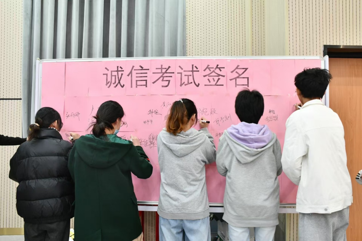 为强化诚信意识,大会现场还举行庄重的诚信考试承诺签名,同学们有序在纸上签下名字,一笔一画皆是承诺,彰显了师生共筑诚信校园的坚定信念。