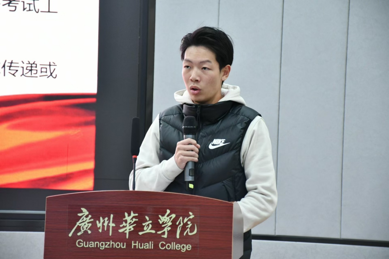 随后学生代表刘至谦讲解考试作弊行为认定,他说携带违规物品,抄袭行为,替考情况,使用通讯设备作弊,交头接耳等一系列行为均被认定为作弊。讲解现场庄重严肃,同学们对考试行为充满敬畏之心。