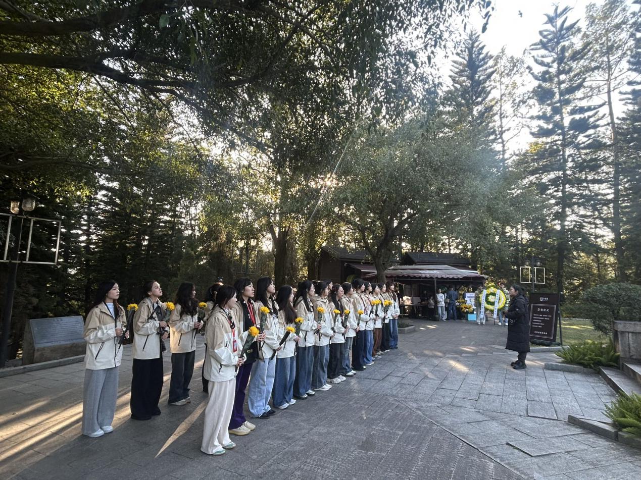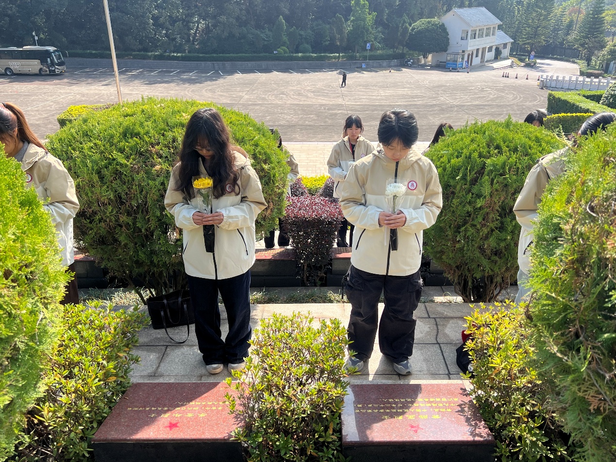 第三站,研学队伍前往柳州烈士陵园开展缅怀活动。陵园内,高大的烈士纪念碑巍然矗立于层层台阶之上,师生们庄重肃立,向纪念碑行鞠躬礼,表达对革命先烈的深切敬意。随后,大家手持菊花,缓步走向烈士墓前,一一敬献鲜花,寄托对英魂的哀思与缅怀。在迎风飘扬的五星红旗下,全体师生齐声高唱国歌,激昂的歌声在陵园中回荡,凝聚着对先烈“舍生取义、为民奉献”精神的崇高礼赞。