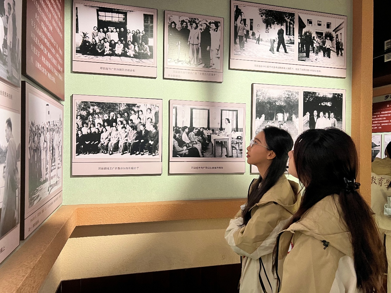 研学队伍首站抵达邓颖超纪念馆。作为“南宁女儿”精神传承的重要载体,馆内的珍贵文物、历史图片与情景剧片段,都全方位展现了邓颖超同志从革命岁月到建设时期的光辉一生。师生们在一件件实物、一段段记述前驻足凝望,沉浸于那段波澜壮阔的历史之中,深刻感受到老一辈革命家坚定的理想信念与深厚的家国情怀。这场跨越时空的精神对话,不仅加深了同学们对红色历史的认知,更激发起大家在未来学习与生活中勇担使命、砥砺前行的内在动力。