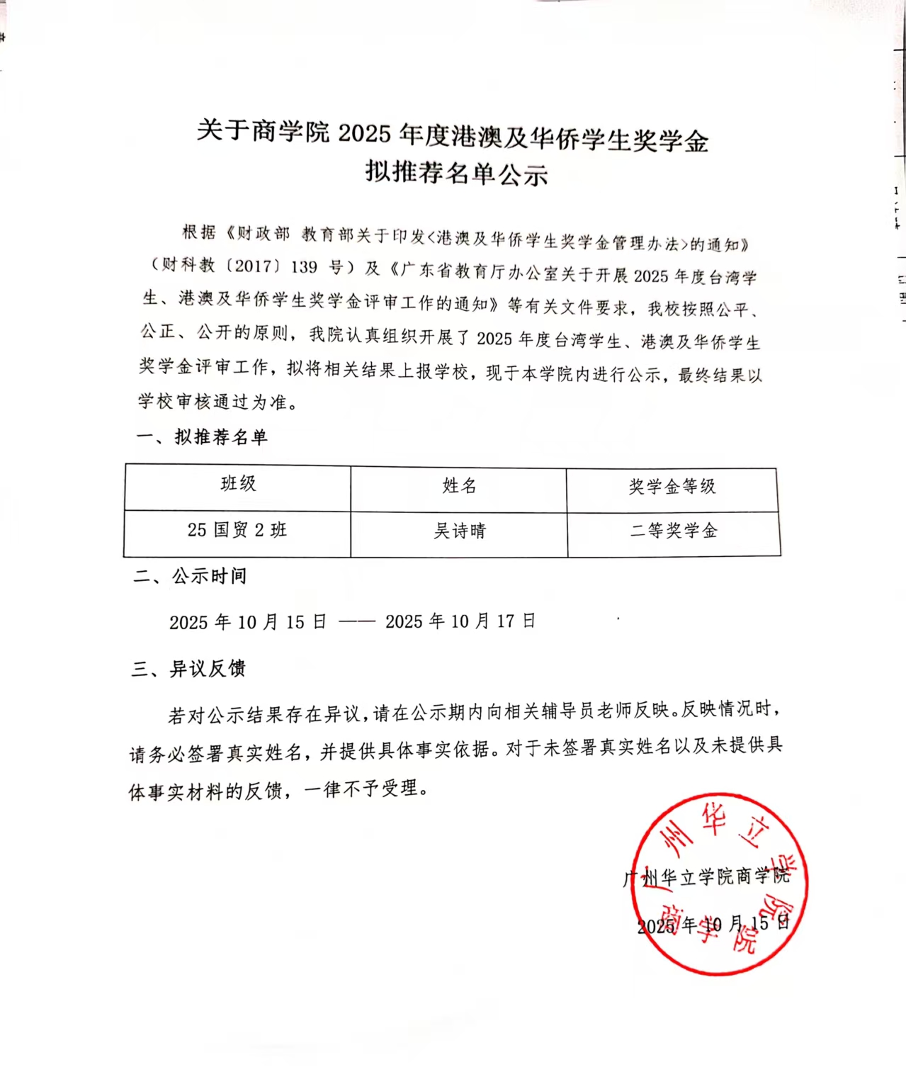 关于商学院2025年度港澳及华侨学生奖学金拟推荐名单公示