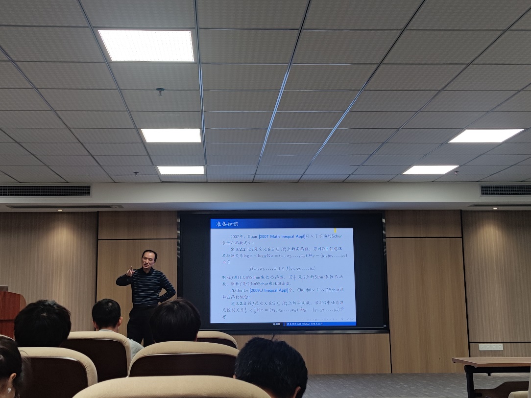 在此次讲座中,孙教授首先梳理了Guan在其论文中定义的一类对称函数的Schur凸性,并对其相关成果进行了扩展。紧接着,他探索了新定义的一类对称函数的Schur凸性、乘性凸性和调和凸性。通过利用Schur凸函数自变量的特定变换,孙教授成功推导出了其他几类对称函数的Schur凸性,并运用控制理论建立了一些新的不等式。值得一提的是,他还提出了Sharpiro不等式和Ky Fan不等式的一个共同推广,以及Safta猜想在高维空间的推广。