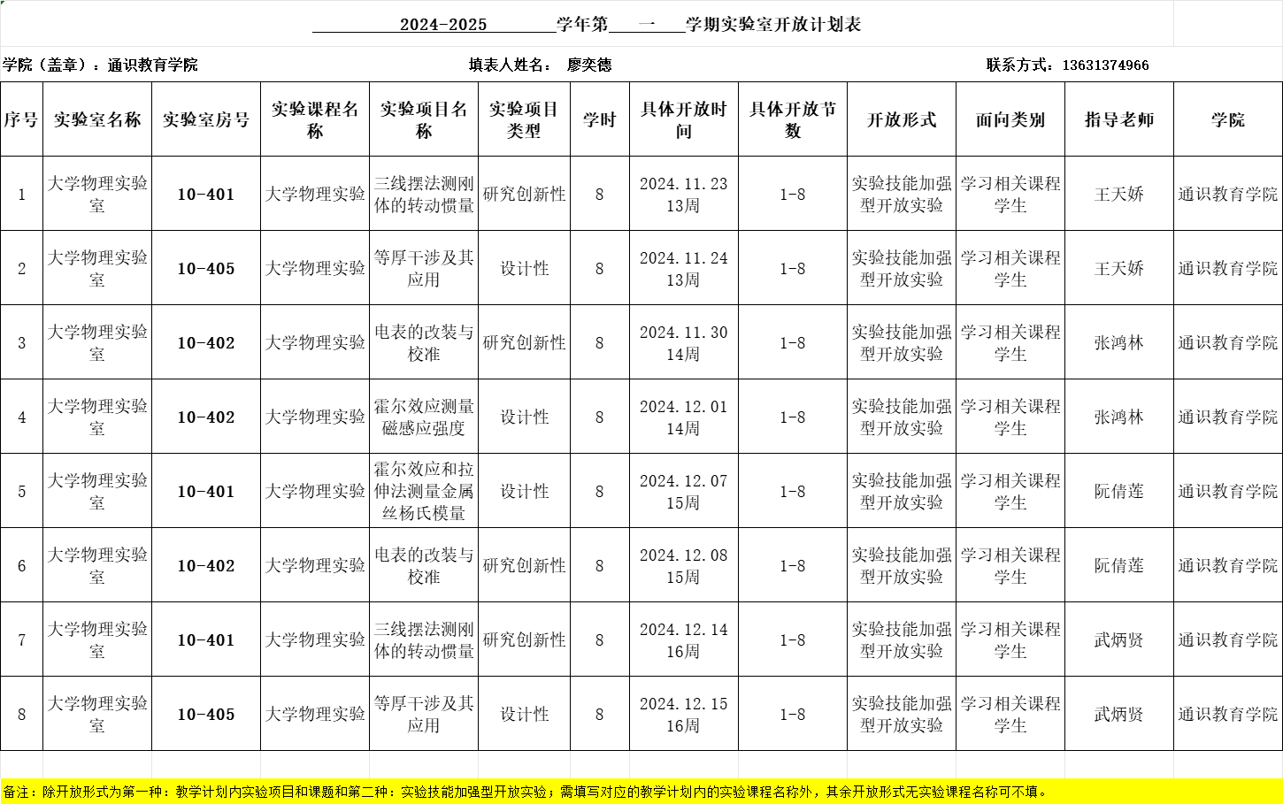 物理实验室2024-2025学年第一学期周末开放安排 发布时间:2024-11-30 17:26:04 浏览次数: 次 【字体:小 大】 为提高学生的创新实践能力,更好地培养应用型人才,推进实验教学改革,物理实验室将对学生进行课外开放,增加实验室的开放时间和开放内容,欢迎同学们到相关专业实验室学习。本学期周末开放安排如下:添加图片描述 通识教育学院2024年11月30日 终审:通识教育学院 分享到: 【打印正文】