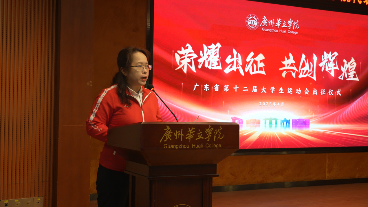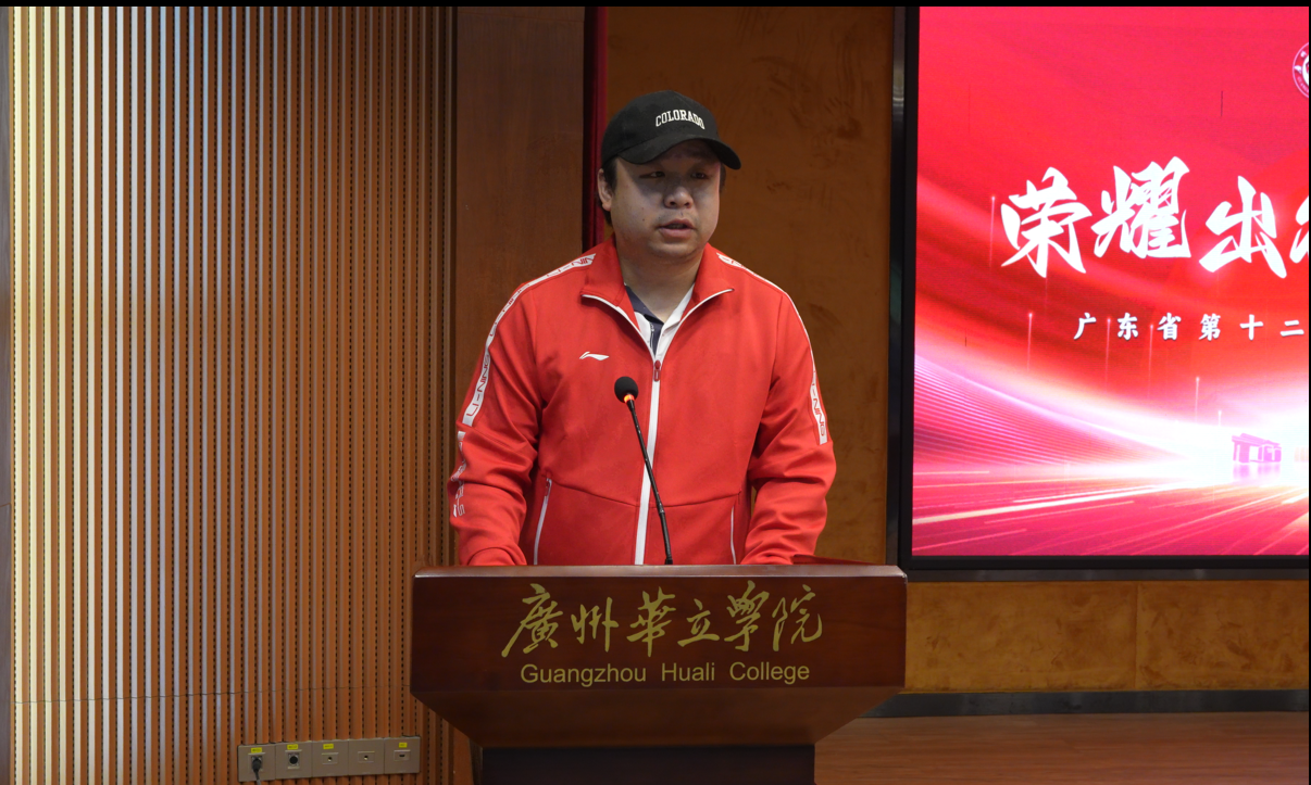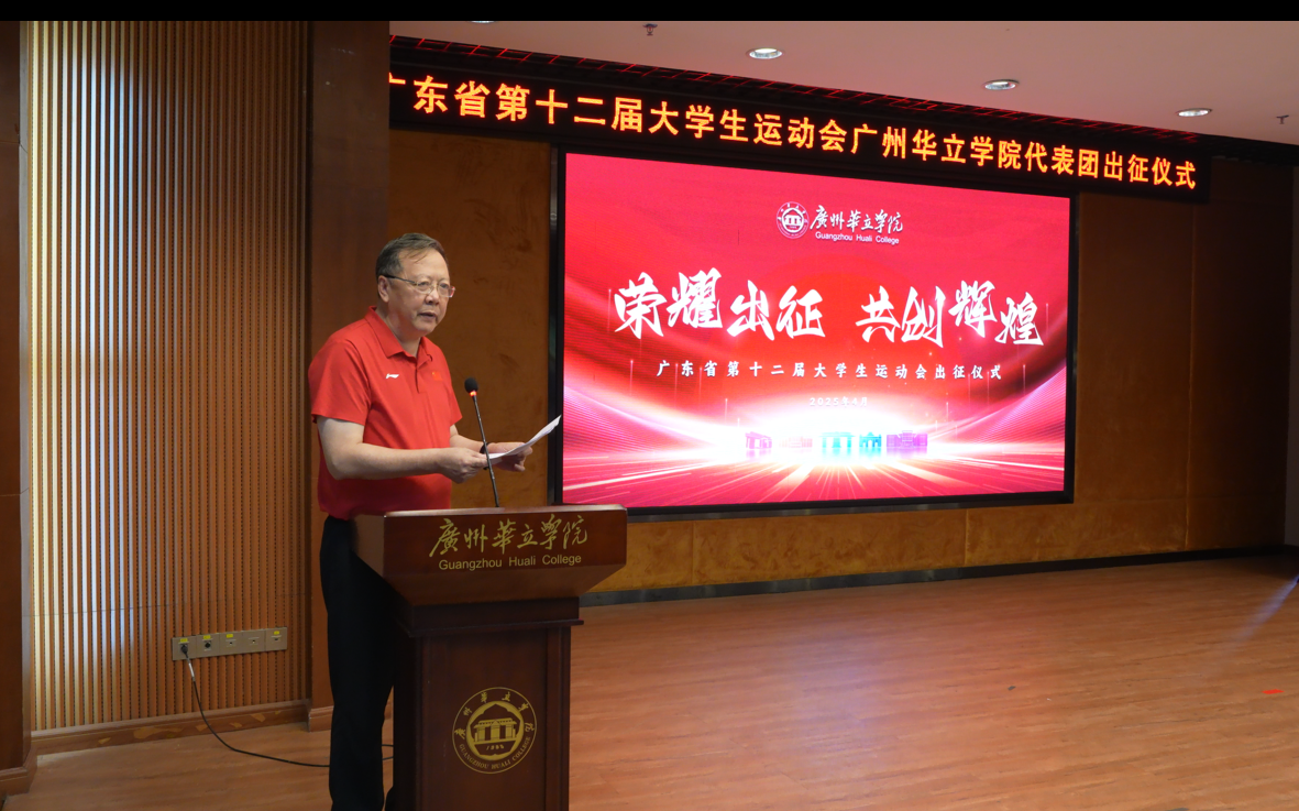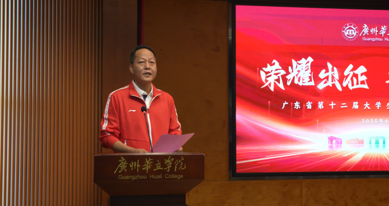 黄秋文副校长代表学校作动员讲话并代表学校领导班子,向即将踏上赛场的运动员、领队和教练员们致以最诚挚的祝福和最美好的祝愿!同时,也向为本次出征付出辛勤努力的体育学院全体师生表示衷心的感谢和崇高的敬意!他指出,广州华立学院高度重视体育工作,不断加大投入,完善体育设施,加强师资队伍建设,推动体育事业取得了显著成效。同时,他向代表团全体成员提出三点期望。一是要严格遵守比赛规则,尊重对手、尊重裁判、尊重观众,展现出良好的体育道德风尚;二是要注意安全,加强自我保护意识,确保在比赛中不受伤害;三是要珍惜这次比赛机会,积累经验、锻炼能力、提升水平,为今后的体育事业发展打下坚实的基础。