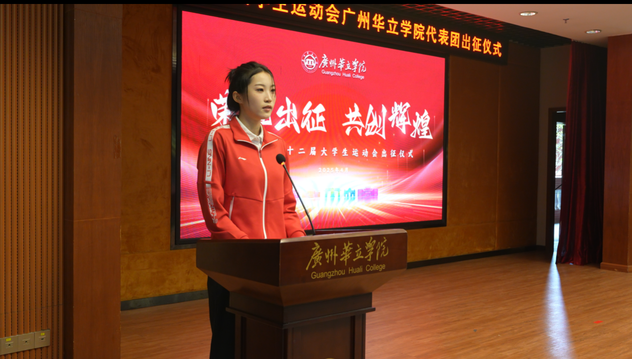 田径队教练员刘一鸣作为领誓人,带领代表团全体人员宣誓:“弘扬体育精神,恪守竞赛规则;服从裁判、尊重对手,团结协作、顽强拼搏;以青春热血展现华立学子风采,以优异成绩为校争光!”