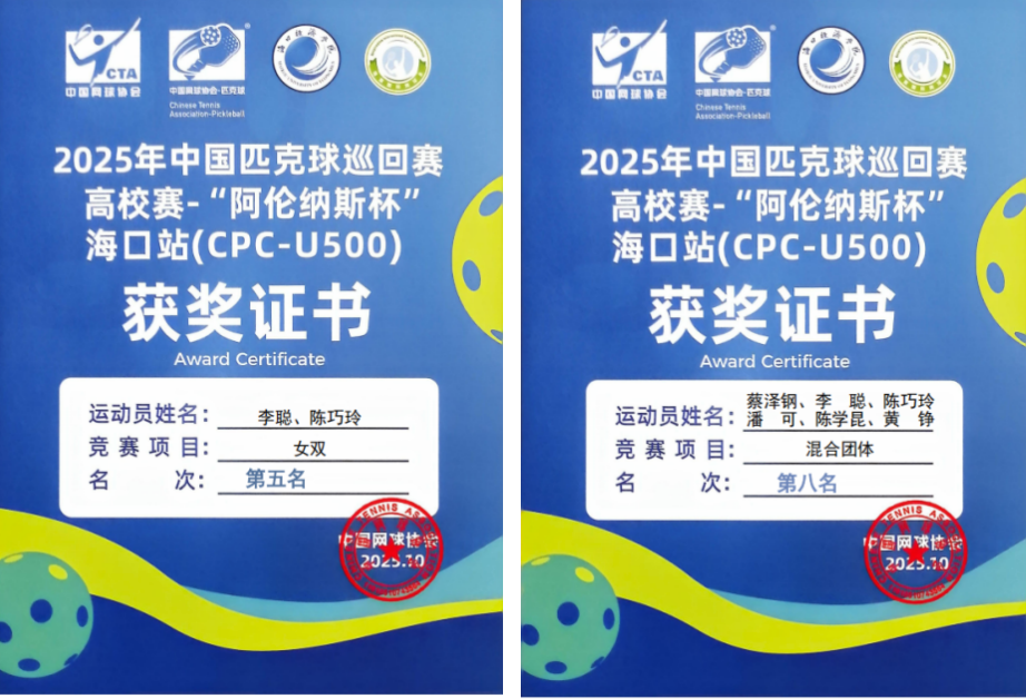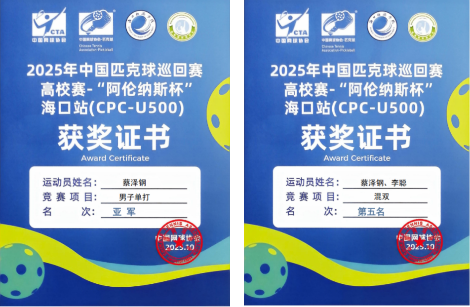 特别是男子单打选手蔡泽钢,在与全国赛会种子选手(中国匹克球巡回赛高校赛CPC-U积分1号种子、2号种子、6号种子)的激烈竞技中,顶住赛程极度紧凑的压力、突破个人体能储备的极限、激发顽强意志的拼搏力,以无与伦比的个人水平发挥、以一匹赛会“黑马”之势,一路“过关斩将”,在其技惊四座之下,最终取得本次全国性赛会亚军的优异成绩,充分展现了其深厚的体育拼搏精神和超绝的竞技水平。