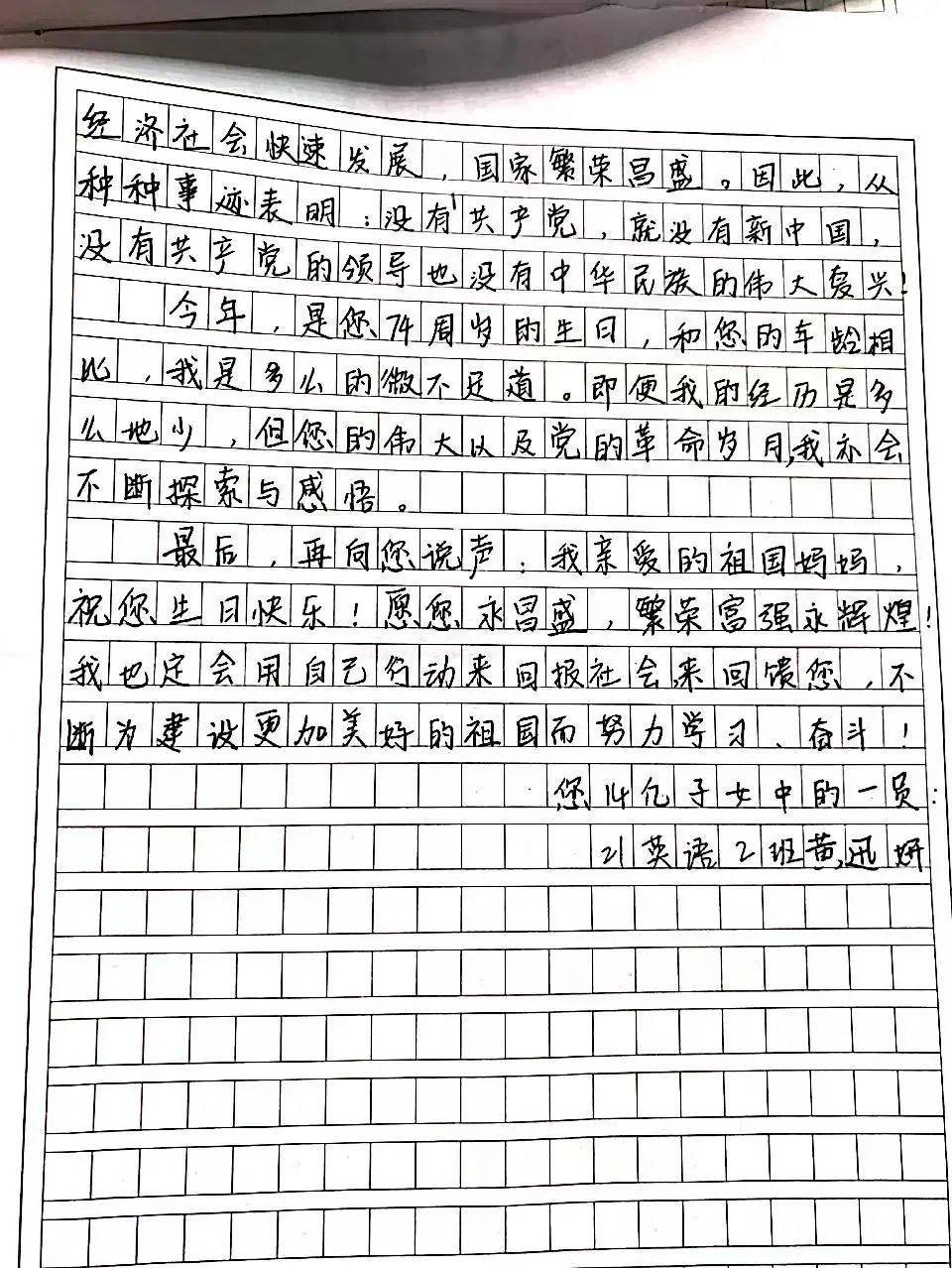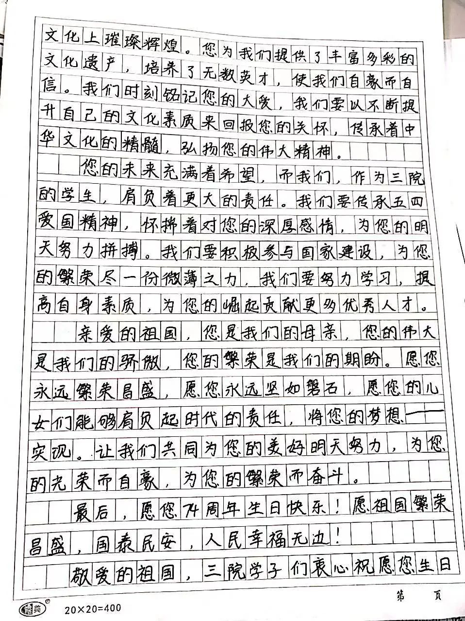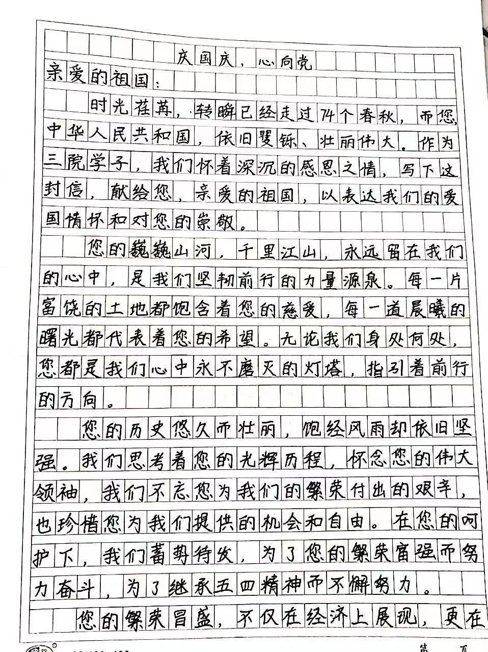 为抒发爱国情怀,厚植爱国精神,在新中国成立的74周年之际,经贸学院、外国语学院和城建学院党总支举办了“庆国庆,心向党”系列活动之“致祖国74周岁的一封信”征文活动。接下来,让我们一起来感受同学们对祖国的深情告白,选出你最喜欢的作品吧!