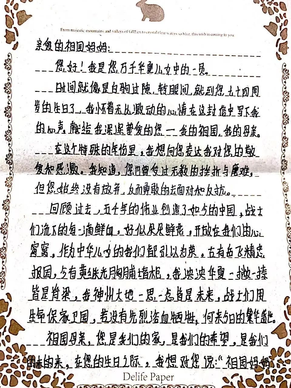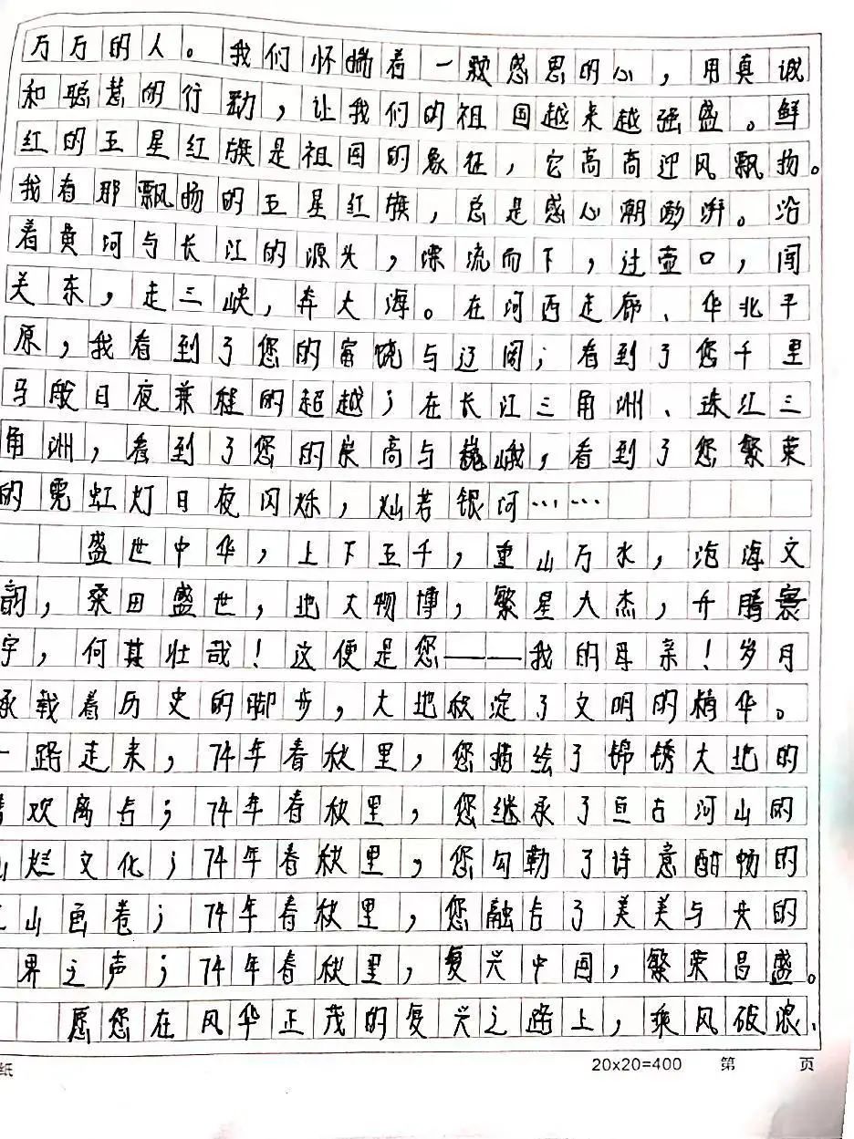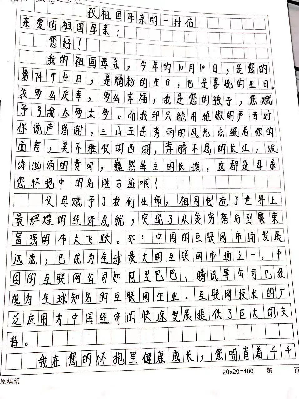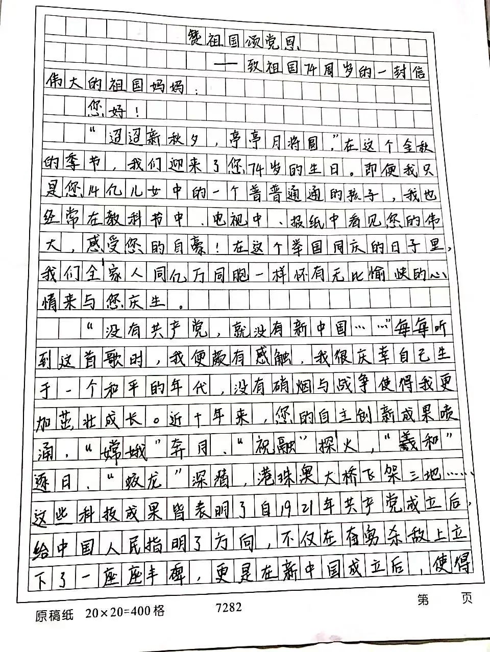 为抒发爱国情怀,厚植爱国精神,在新中国成立的74周年之际,经贸学院、外国语学院和城建学院党总支举办了“庆国庆,心向党”系列活动之“致祖国74周岁的一封信”征文活动。接下来,让我们一起来感受同学们对祖国的深情告白,选出你最喜欢的作品吧!