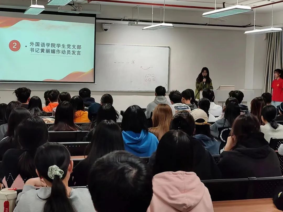 紧接着,外国语学院学生党支部书记黄丽媚作动员发言。会议上提到,党史是最好的营养剂,它是爱国爱党、明智担责、鉴今资政,把党和国家各项事业不断推向前进的必修课,这门功课不仅必修,而且必须修好,每位大学生都应该以崇仰之情、敬畏之心认真学习党的历史,从中汲取新的智慧和力量。
