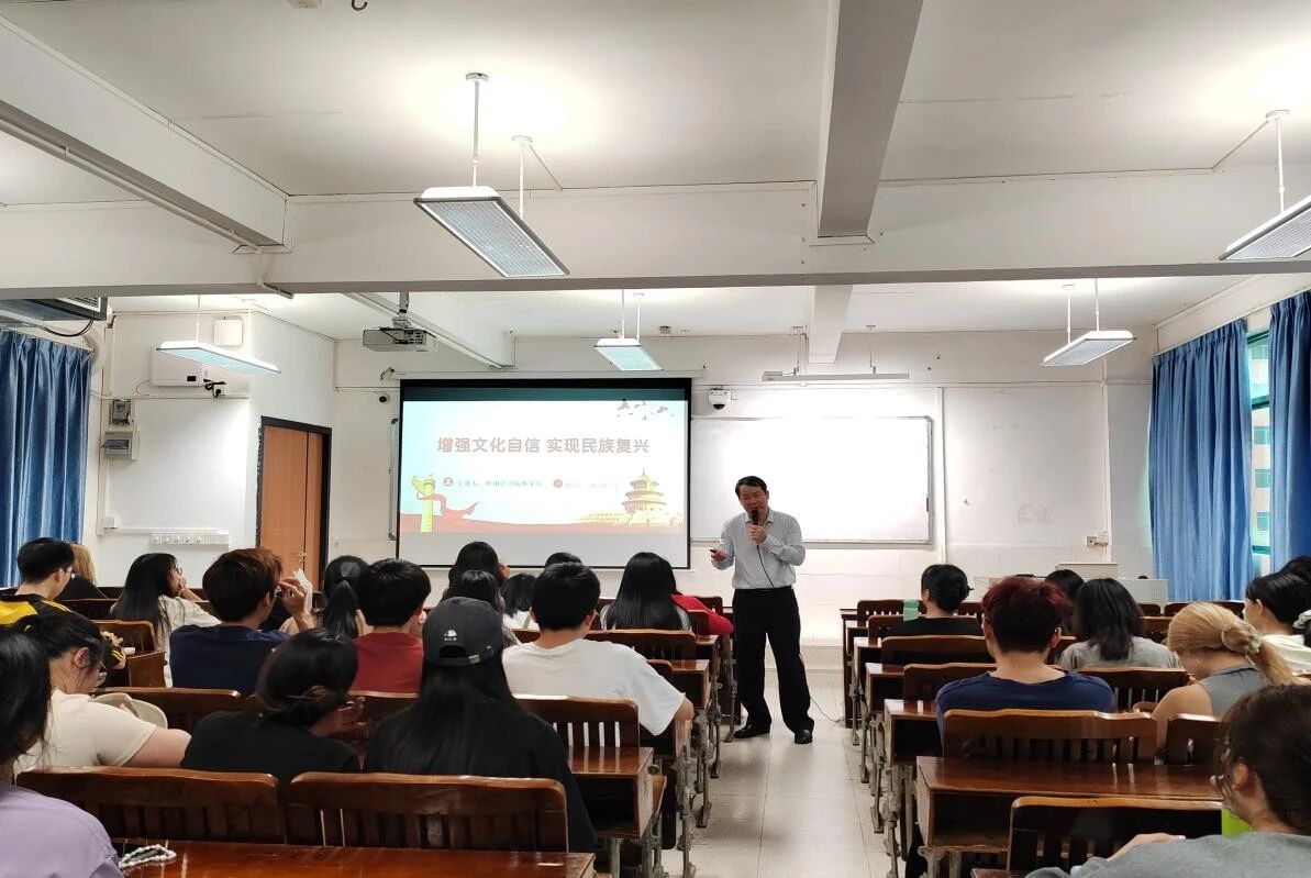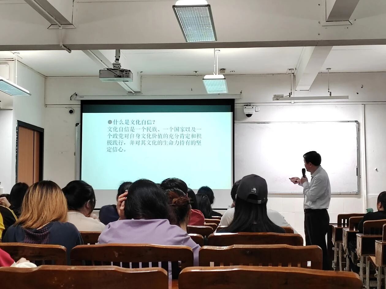 2025年3月13日,广州华立学院外国语学院党总支组织开展“思政第一课”专题学习活动。本次课程由外国语学院院长蔡荣寿教授主讲,以“增强文化自信 实现民族复兴”为主题,深入解读文化自信的核心内涵与时代价值,引导青年学子增强文化认同,自觉担当中华优秀传统文化的传承者与弘扬者,为新时代文化强国建设贡献青春力量。