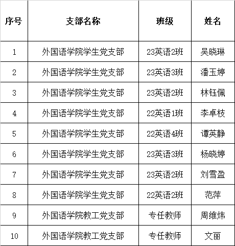 根据《中国共产党章程》和《中国共产党发展党员工作细则》的相关规定,经外国语学院党总支考察及讨论,决定将吴晓琳等10名同志拟列为2025年上半年党员发展对象(名单附后)。