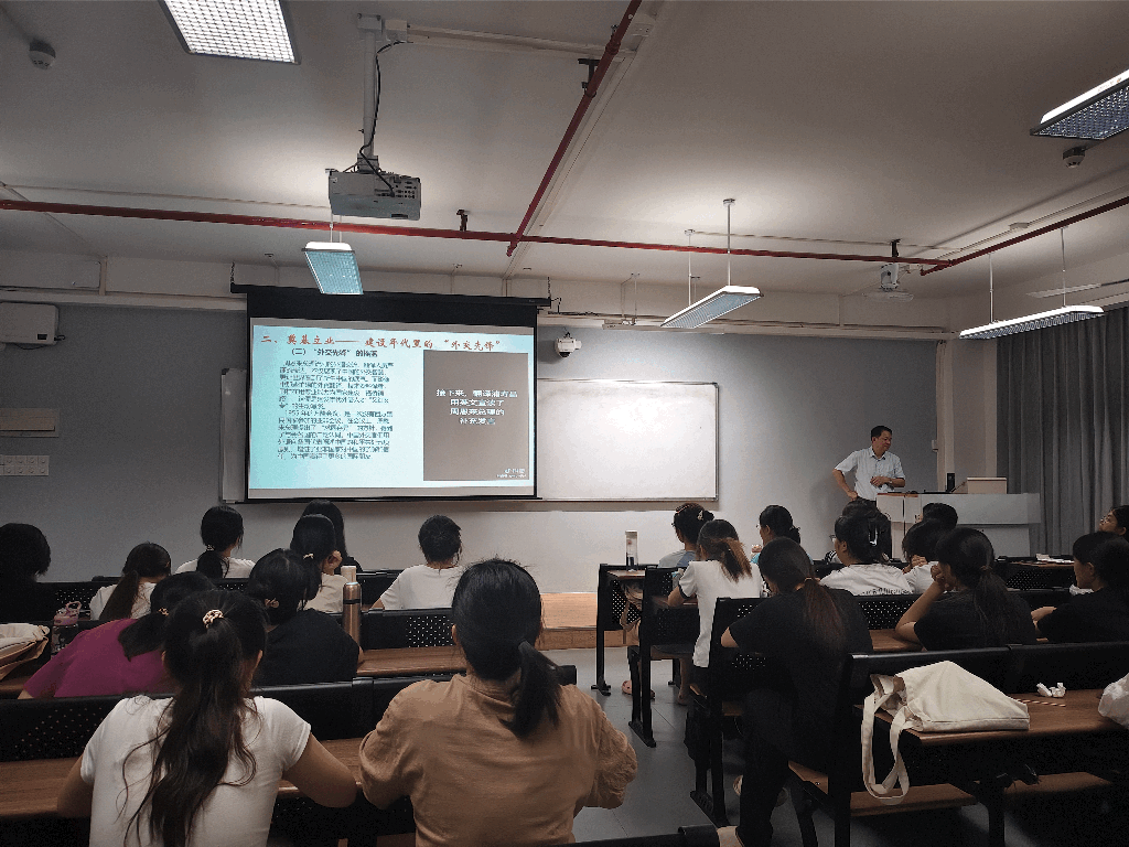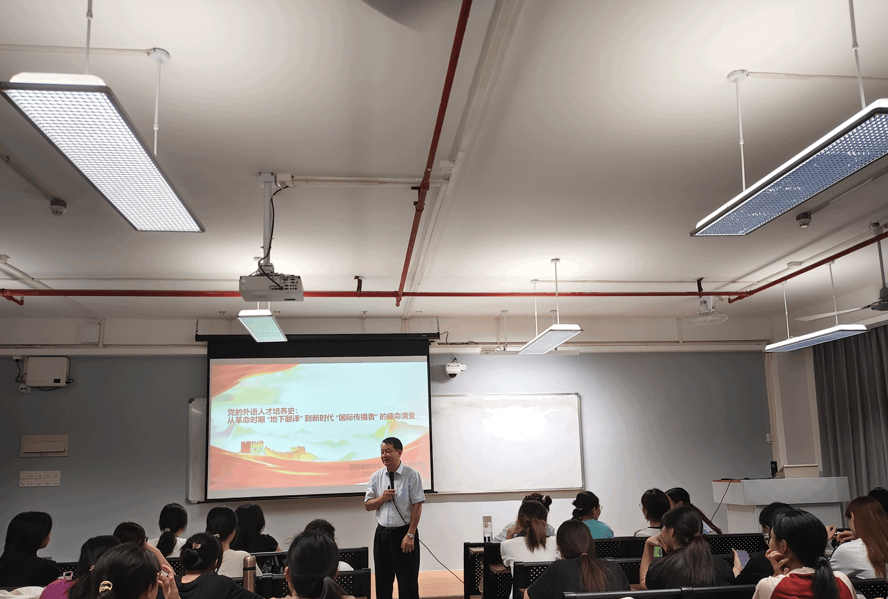 随后,课程沿着时代脉络展开:院长指出,新中国成立后,外语的角色发生了根本性的转变。它从革命时期隐蔽的 “地下武器”,走到了国家建设的 “地上前台”;从边缘的辅助性角色,走向了国家发展的 “中心舞台”,肩负起了崭新的历史使命。新中国的外交、外贸、国防、文化建设等各个领域,都急需大量专业的外语人才。党的外语人才培养,也由此进入了一个 “奠基立业” 的规模化、体系化新阶段。北京外国语学院等院校成立,外语人才化身“外交先锋”,在万隆会议上传递中国声音,助力新生共和国打破西方封锁。建设年代,外语人才的作用不仅仅局限于外交领域。当时的对外贸易、工业援建、科技文化交流等各个领域,都离不开外语人才的支持。这一时期的外语人才,既是 “专业型” 人才,又是 “全能型” 人才。改革开放后,“英语热”兴起,外语人才成为“沟通桥梁”,在经贸、科技领域架起中外交流纽带。谈及新时代,蔡院长强调: “党的外语人才培养使命,迎来了又一次深刻的升华。新时代的外语人才,不再是简单的 “传声筒” 或 “沟通桥梁”,而是被赋予了战略性的新使命 —— 成为卓越的 “国际传播者” 和 “全球治理者”。我们的党的外语人才主要工作已从‘翻译世界’转向‘翻译中国’。 结合“人类命运共同体”“中国式现代化”,他指出,外语人才需兼具语言能力与“话语体系构建能力”,向世界讲好中国故事。