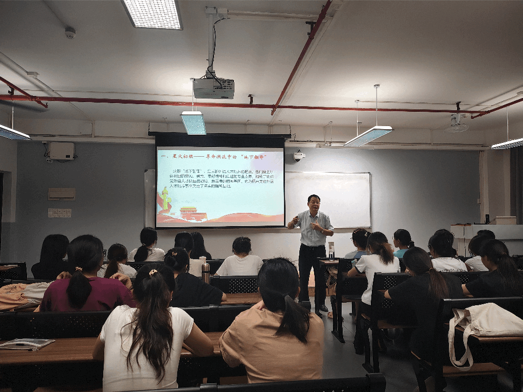 课堂伊始,蔡荣寿院长以革命年代为起点,勾勒早期外语人才的担当:在白色恐怖笼罩下,“地下翻译”们以笔为刃,在柴屋油灯下译介《共产党宣言》等著作,像陈望道那样蘸墨品“信仰之甜”,将马克思主义真理传入中国。这些 “地下翻译” 的使命,可以概括为三个关键词:“窃火”、“传信”、“求生”。每一项使命,都与革命事业的生死存亡息息相关。“他们学外语,是为民族求存!”院长的讲述,让学子们读懂外语学习最初的家国底色。