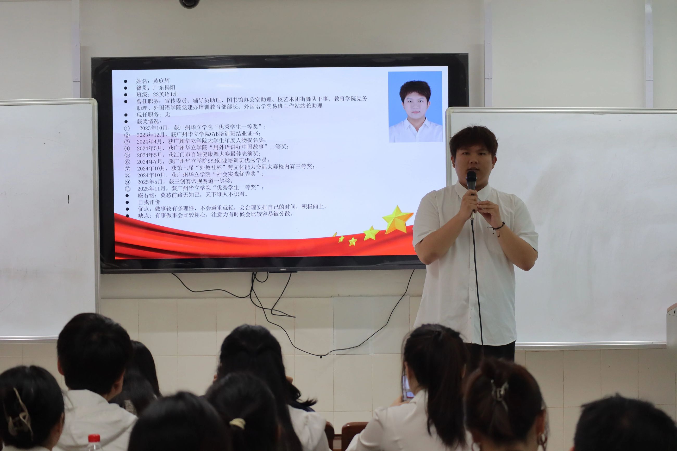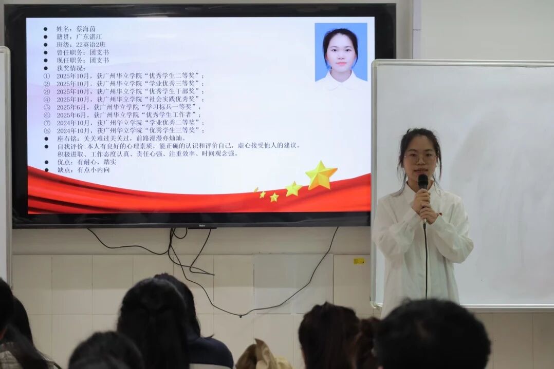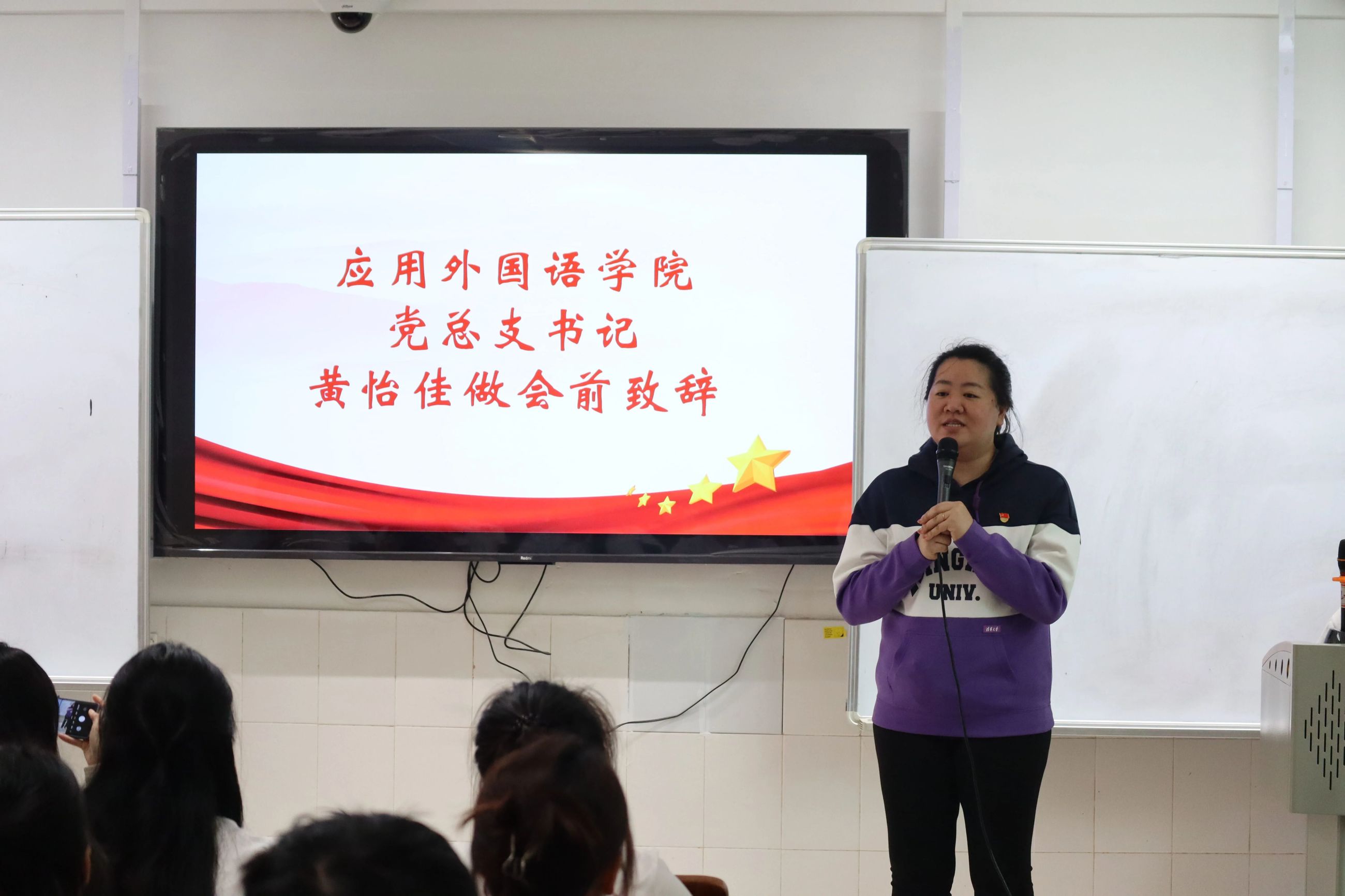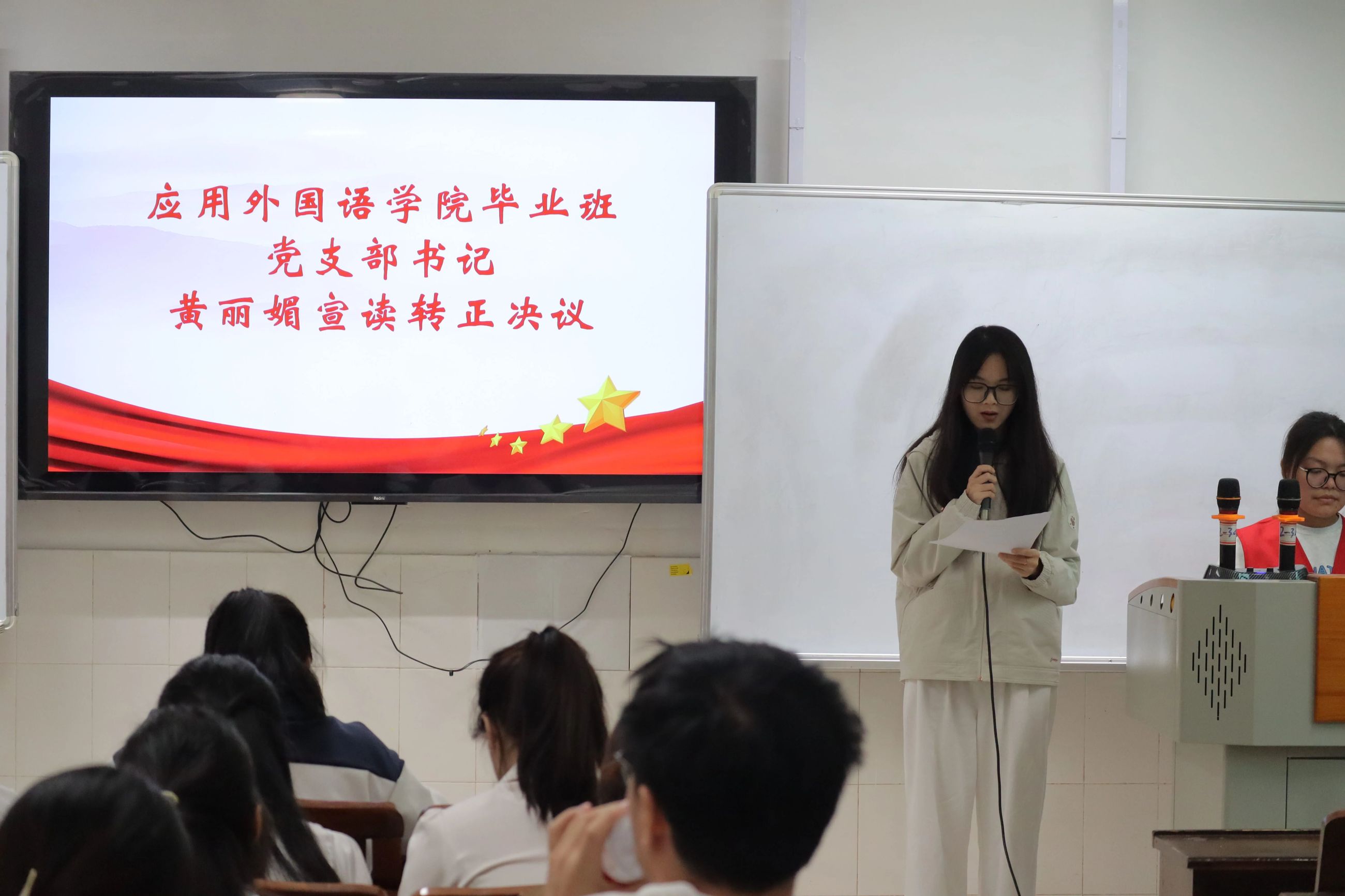 应用外国语学院毕业班党支部书记黄丽媚宣读转正决议。她对新转正的党员表示祝贺,并强调:成为正式党员,意味着更高的责任与更重的使命。希望各位同志以此次转正为新起点,在今后的学习工作中持续加强党性修养,以实际行动践行共产党员的初心和使命。