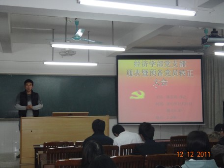 2011年12月12日18:30经济学部党支部在二号楼208召开支部大会。本次大会中有12名入党积极分子如期转为中共预备党员以及有7名预备党员转为中共正式党员。