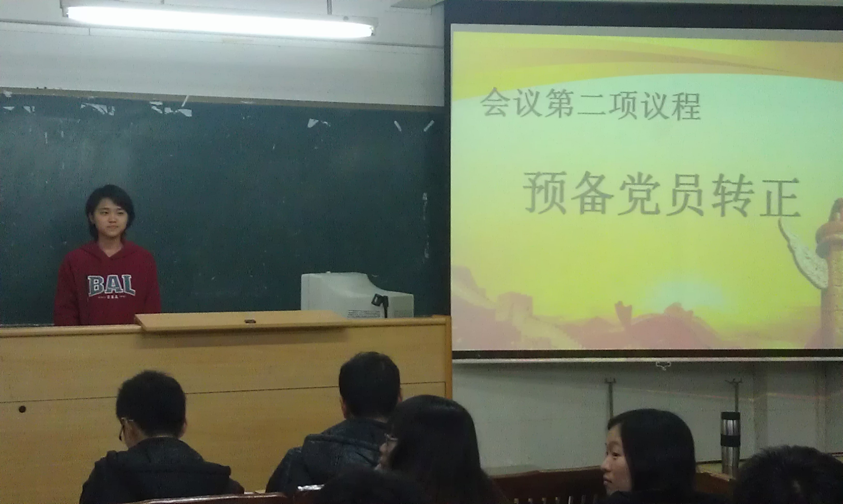 本次会议第一项议程。发展对象通表,图为发展对象上台发言,同与会人员分享了自己的入党历程及心路变化。
