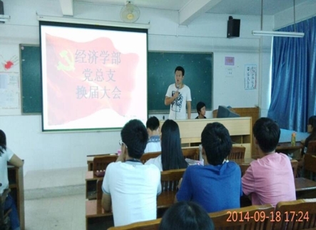 2014年9月18日下午5点15分,经济学部党总支在2-209召开年度换届大会。出席本次会议的有经济学部党总支书记陈崇高以及经济学部全体学生党员。