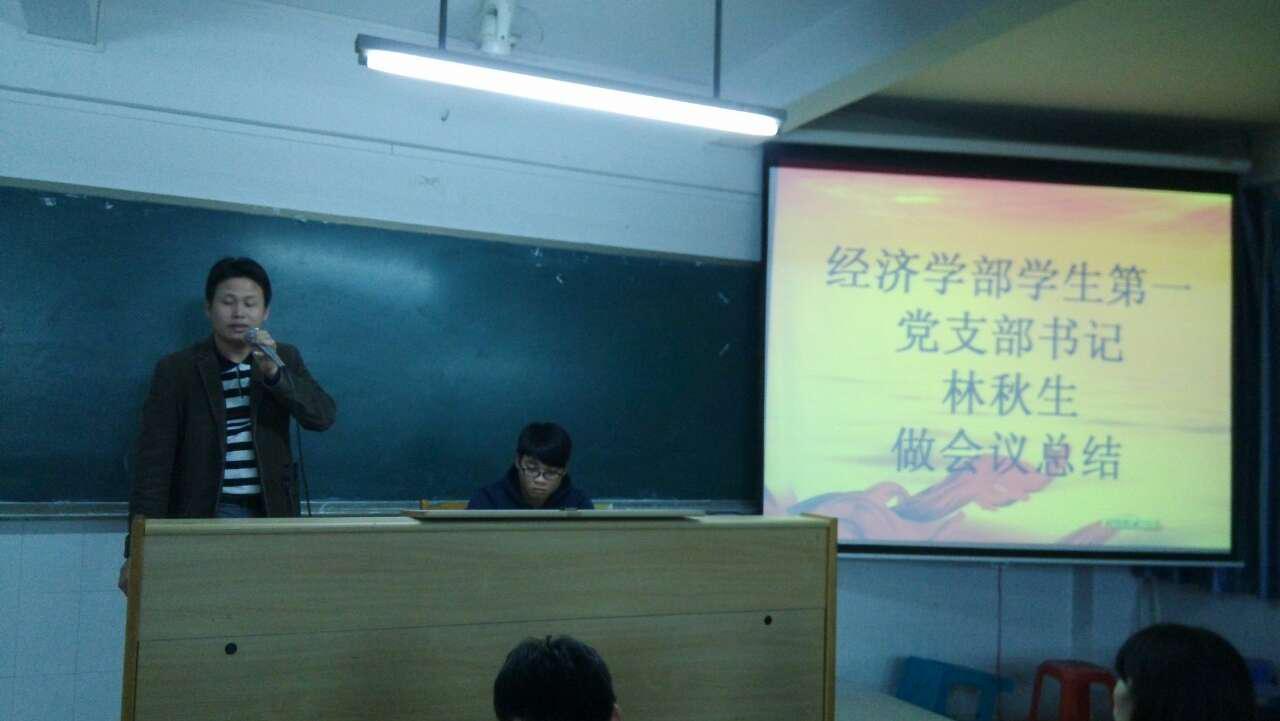 最后,由经济学部学生第一党支部书记林秋生老师作会议总结,他祝贺了本次成功转为预备党员的三名发展对象和成为正式党员的两名同志,同时也强调全体学生党员必须从实际出发,分析自身的不足,不断完善自己,争取更大的进步,能够在校园里把党员的先锋模范作用发挥到最好,做一名优秀的共产党员。