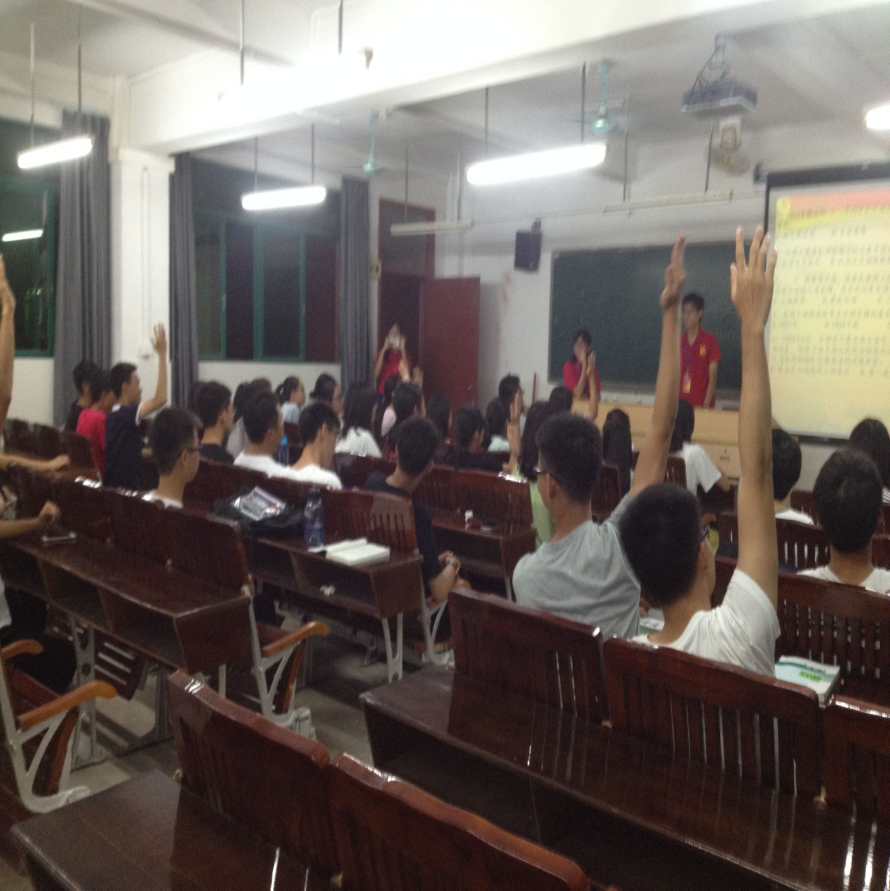 其他党员同志则采取了播放小视频,另外加党的小知识的题目,看看大家多么活跃,简单的规则(一二三,举手)深受新生们的喜爱,瞧那些小手闪亮在我们的眼前。