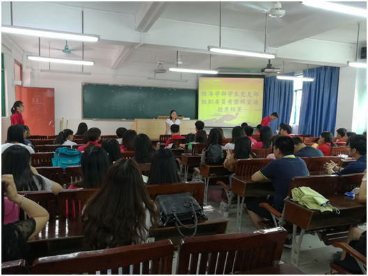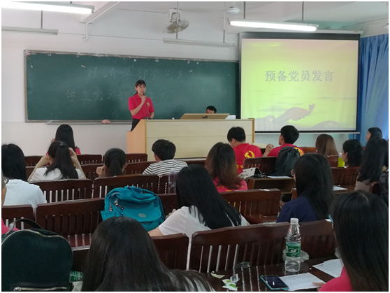 2017年6月17日中午12:00,经济学部学生党支部于2号教学楼301课室召开了2017年上半年预备党员转正大会,参加本次会议的有:经济学部党总支学生党支部书记方惠英、经济学部学生党员、预备党员以及发展对象,经济学部党务秘书。