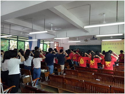 最后,在主持人的带领下,与会人员进行了入党宣誓。入党誓词时刻提醒着学生党员们要以高标准、高要求来严格要求自己,以身作则,做好先锋模范作用,积极关心了解国家大事,努力提高自身水平,学好本专业知识,立足本职工作,努力为本学部的发展献出自己的一份力量。至此,经济学部学生党支部转正大会圆满结束!
