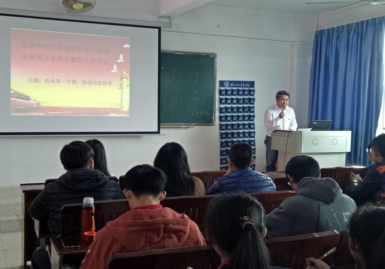 2017年12月15日12:10,经济学部学生党支部在2-301召开了2017年12月民主生活会,出席本次会议的有:经济学部党总支书记吴贤、经济学部党总支学生党支部书记方惠英、经济学部全体党员、入党积极分子以及党务秘书,本次会议主题是“传承第一军规,加强党性修养。”