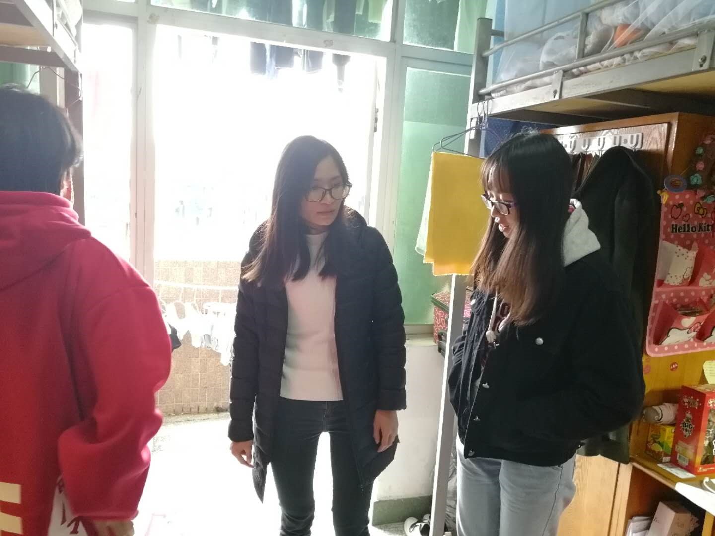2017年12月29日下午4:00,经济学部学生党支部书记方惠英、经济学部老师钟云珊、经济学部学生党支部组织委员温嘉慧带领党务工作者走访党员宿舍。经济学部一直坚持党的群众路线,始终坚持从群众中来到群众中去,始终坚持每个月一次走访党员宿舍的活动。通过走访党员宿舍,可以了解学生在宿舍的生活情况,也可以更好地拉近与学生之间的距离以及考察党员是否起到带头作用。
