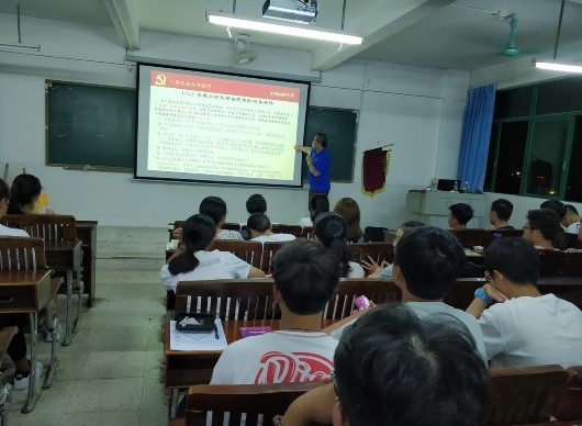 为了深入贯彻学习党的十九大精神,9月13号晚上19:00到21:00,经济学部学生党支部第18期党章培训班第二讲开班,出席本次课程的人员有:经济学部党总支书记吴贤、经济学部学生党支部书记方惠英、经济学部教工党支部组织委员李梅、经济学部学生党员、经济学部全体大一新生学生。
