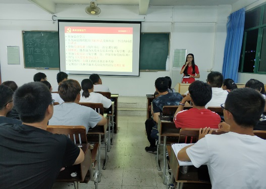 18经济1,2班由方惠英书记授课。方书记在给新生们详细地讲解了关于党的理论知识的同时,也积极响应学生们积极向党组织靠拢,告诫学生在入党道路上应注意的事项和要求,并嘱咐他们严格要求自己、规范自己、约束自己。经方书记有条有理的讲话后,学生们意识到入党是一件十分严谨的事,必须时刻加强对自己的管理,时刻谨记入党的各种注意事项,并在这个过程中努力提升自我价值。