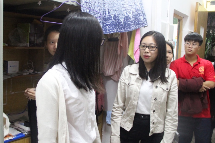 2018年10月16日下午17:30分,经济学部学生党支部书记方惠英在党务秘书、党务助理的陪同下进行走访党员宿舍。一月一次的走访党员宿舍活动一直是我学部的优良传统,通过走访党员宿舍,可以了解学生党员在宿舍的生活情况,以及学生党员在宿舍中是否有起到模范带领作用。