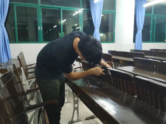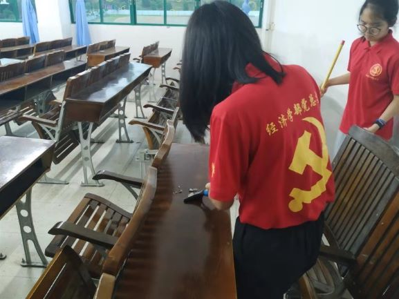 参与人员明确目标后快速地进入工作状态。有的人拿好抹布打湿桌子上张贴已久的广告纸,有的人领来扫帚把桌子上铲出的垃圾清扫完毕,随后就有人把垃圾桶推过来,进行垃圾收集清理。每个人之间相互配合,默契十足。虽然铲除的过程有些费劲,但是每个参与人员都在各个环节做到尽善尽美,看到经过一个多小时的辛勤劳动后变得井然有序、干净整洁的课桌,每个人脸上都洋溢着满足的笑容。此次志愿活动不仅培养了党员的坚韧品格,还调动了在校党员服务同学的积极性。
