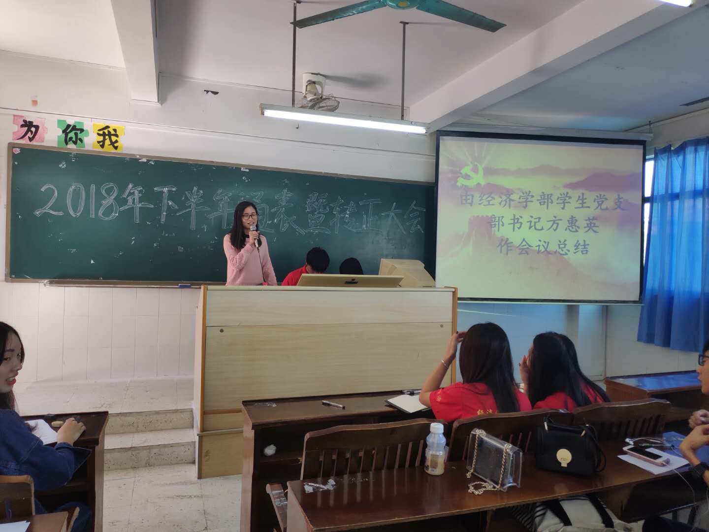 大会第六项,经济学部学生党支部书记方惠英做大会总结。方老师首先对新预备党员的通表和新党员的转正表示热烈祝贺。希望大家继续加强理论的学习,提高政治理论修养;学会戒骄戒躁,继续努力,加强党性修养,早日成为一名合格的党员,不忘初心跟党走。