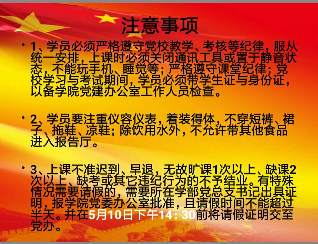 至此,本次第47期入党积极分子暨第3期发展对象培训班动员大会到此圆满结束。通过本次大会,相信学员提高了对党的认识,坚定认真学习的决心,加深了入党信念,增强了对培训内容的期盼。